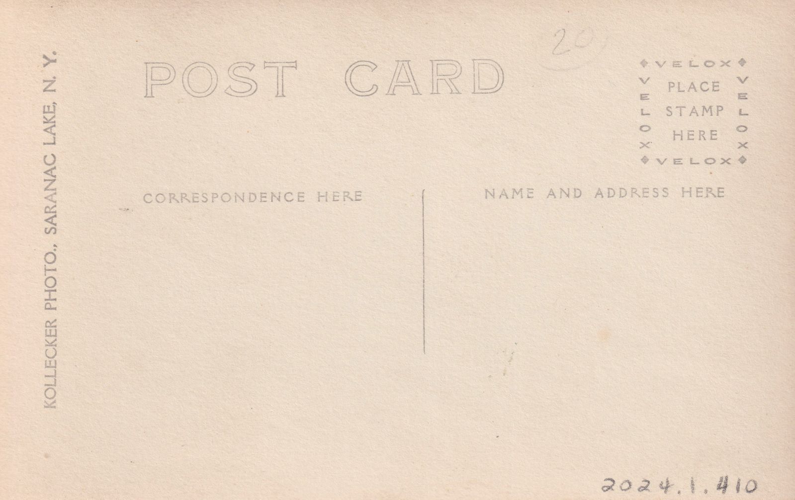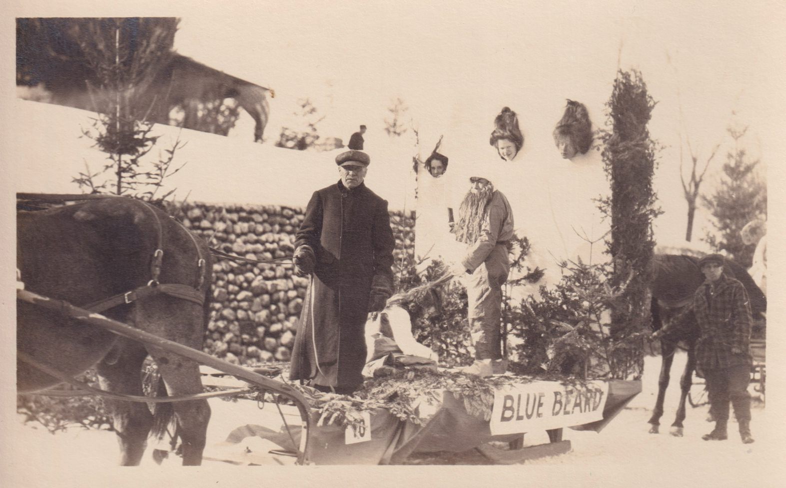 Postcard with a Kollecker photograph of a Winter Carnival parade float: a sleigh with two men and three women. The women are standing with all but their heads behind a white backdrop. One of the men has a long fake beard. A sign attached to the sleigh reads, "Blue Beard."