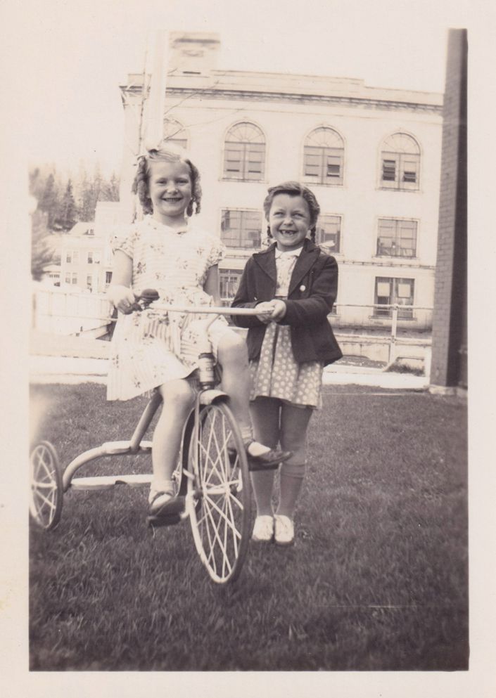 Black-and-White photograph of Joyce Durgin [later Mace] and Helen Taylor [later Zimmerman] in the front yard of 10 Main Street. Joyce is seated on a tricycle, and Helen is holding the handlebars. Both girls are 5 years old and in 1st grade.