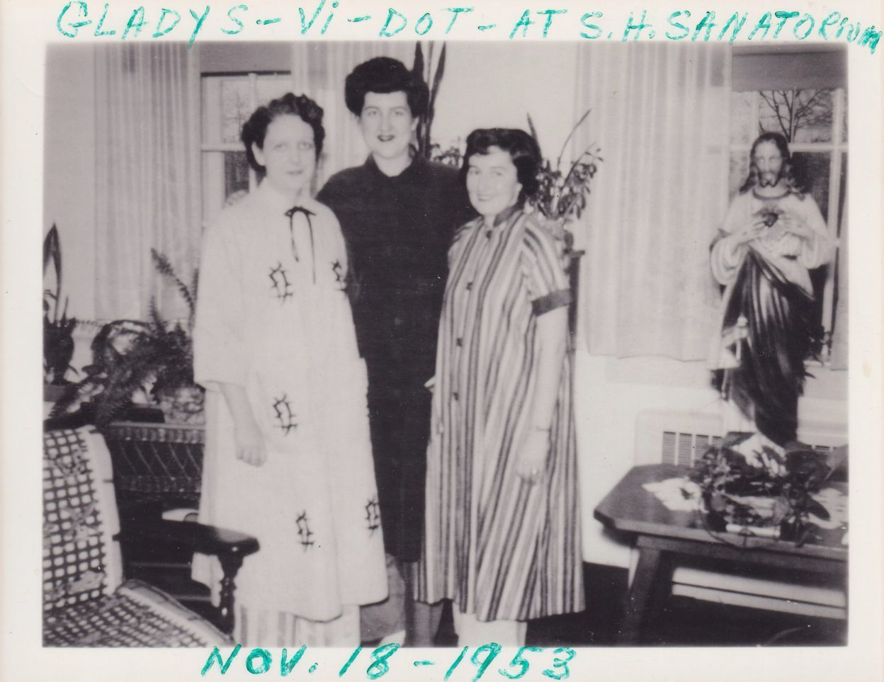 Black-and-White photograph of three women in pajamas standing indoors. Handwritten caption on front reads, "Gladys - Vi - Dot - at S. H. Sanatorium. Nov. 18 - 1953."