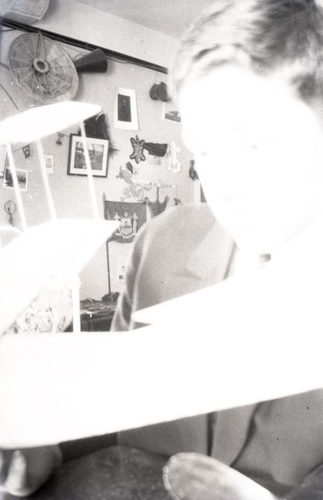Negative of Henry Ives Baldwin holding a small model glider. The room he is in has many decorations on the wall. Most likely taken by Mary Ives Baldwin. This item is not fully cataloged but has been uploaded so the image is publicly available; if you would like us to prioritize cataloging this item, please contact the HSL Collections team.
