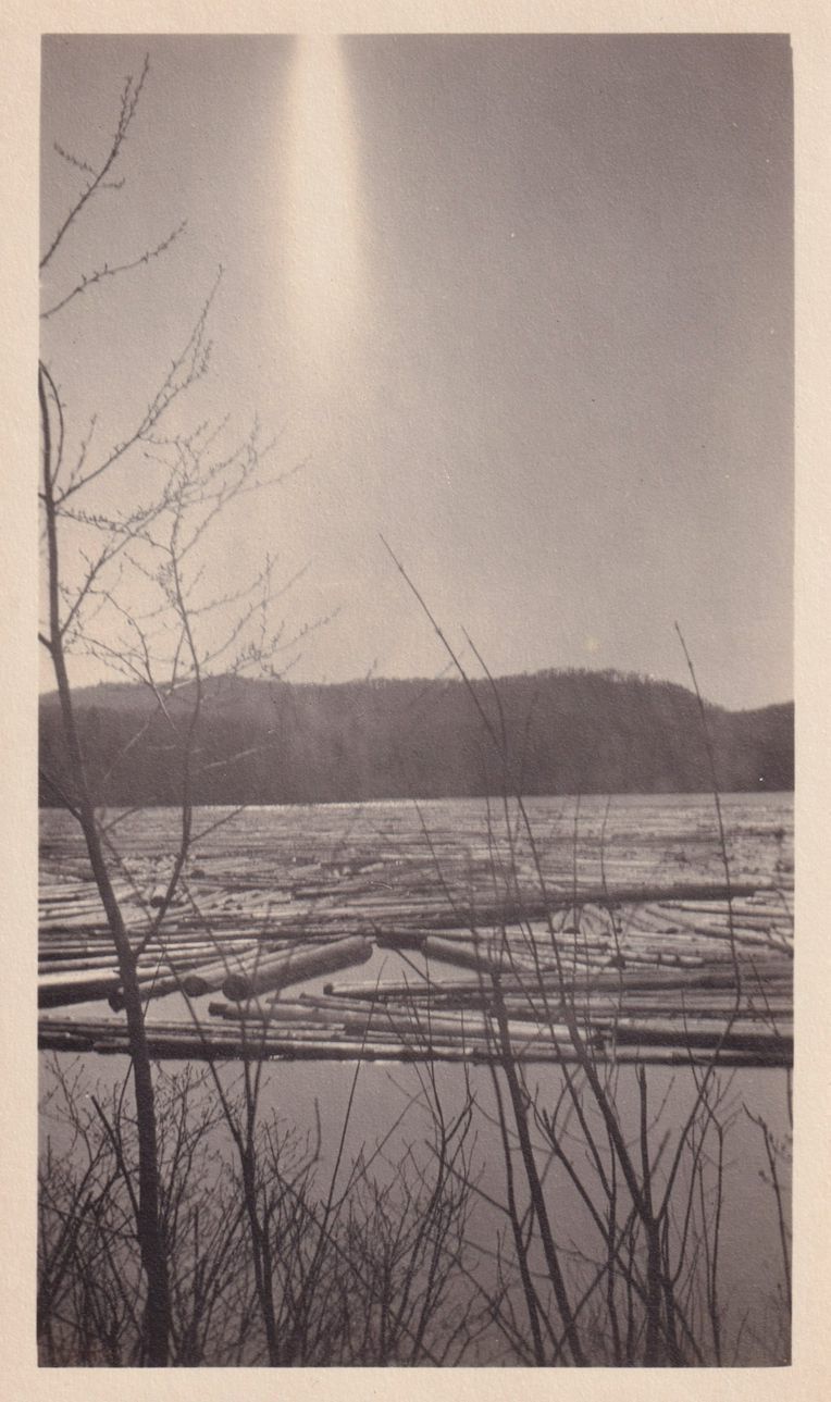Black-and-White photograph of logs floating in an unidentified body of water. The photograph was likely printed by Kollecker's Kodak and Gift Shop.