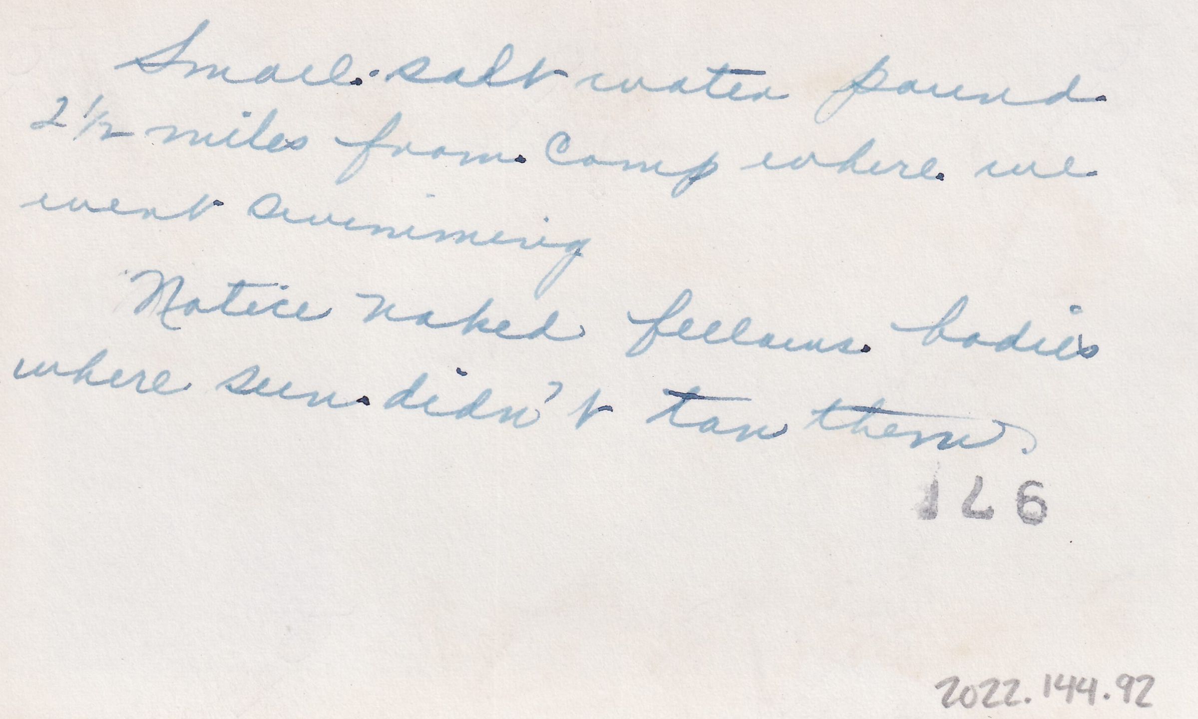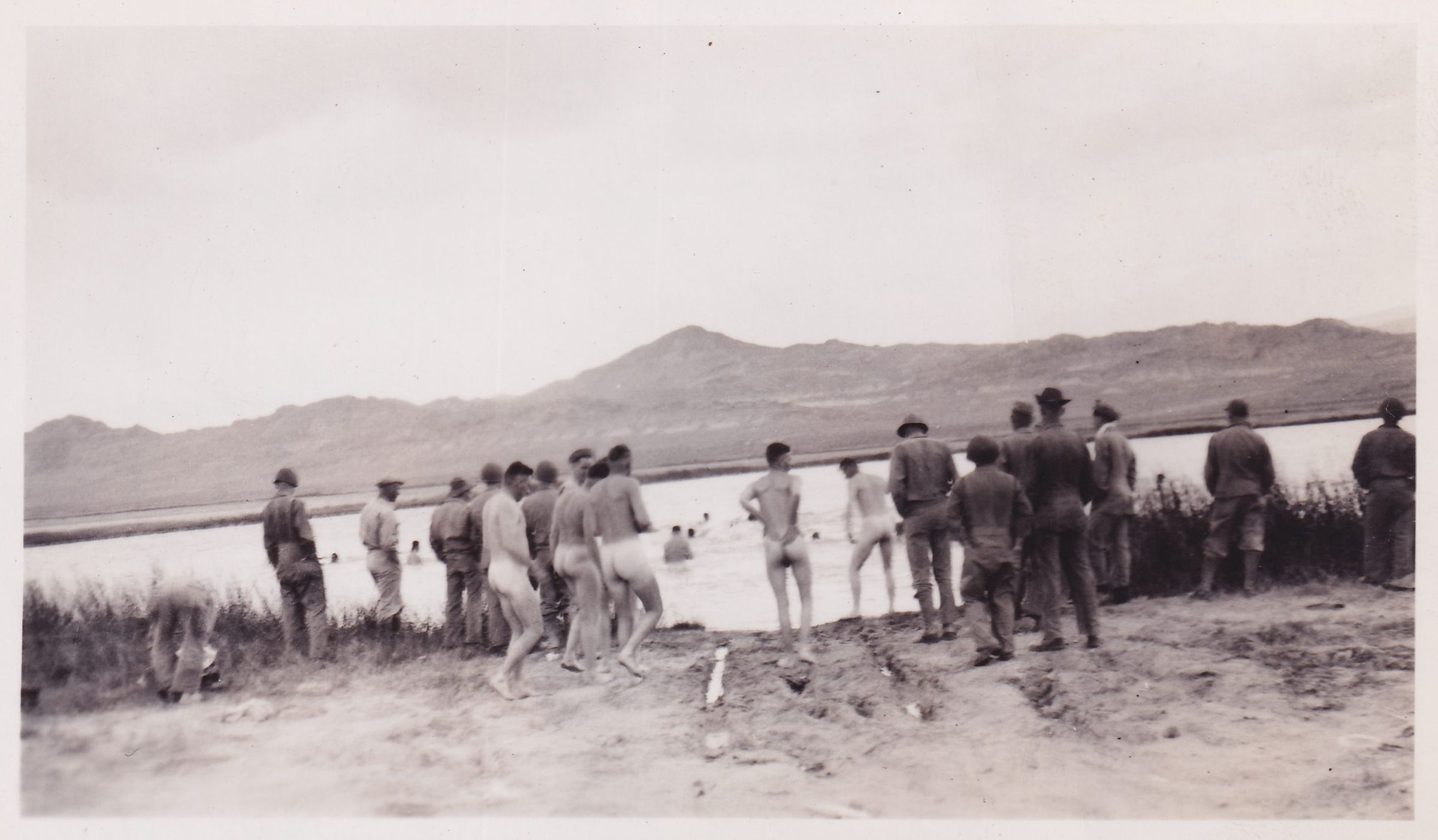 Black-and-White photograph of soldiers standing along the edge of a body of water. Some are nude, the rest are in uniform. Handwritten caption on reverse reads, "Small salt water pond 2 1/2 miles from Camp where we went swimming. Notice naked fellows bodies where sun didn't tan them."