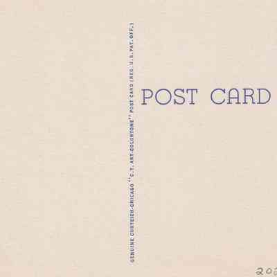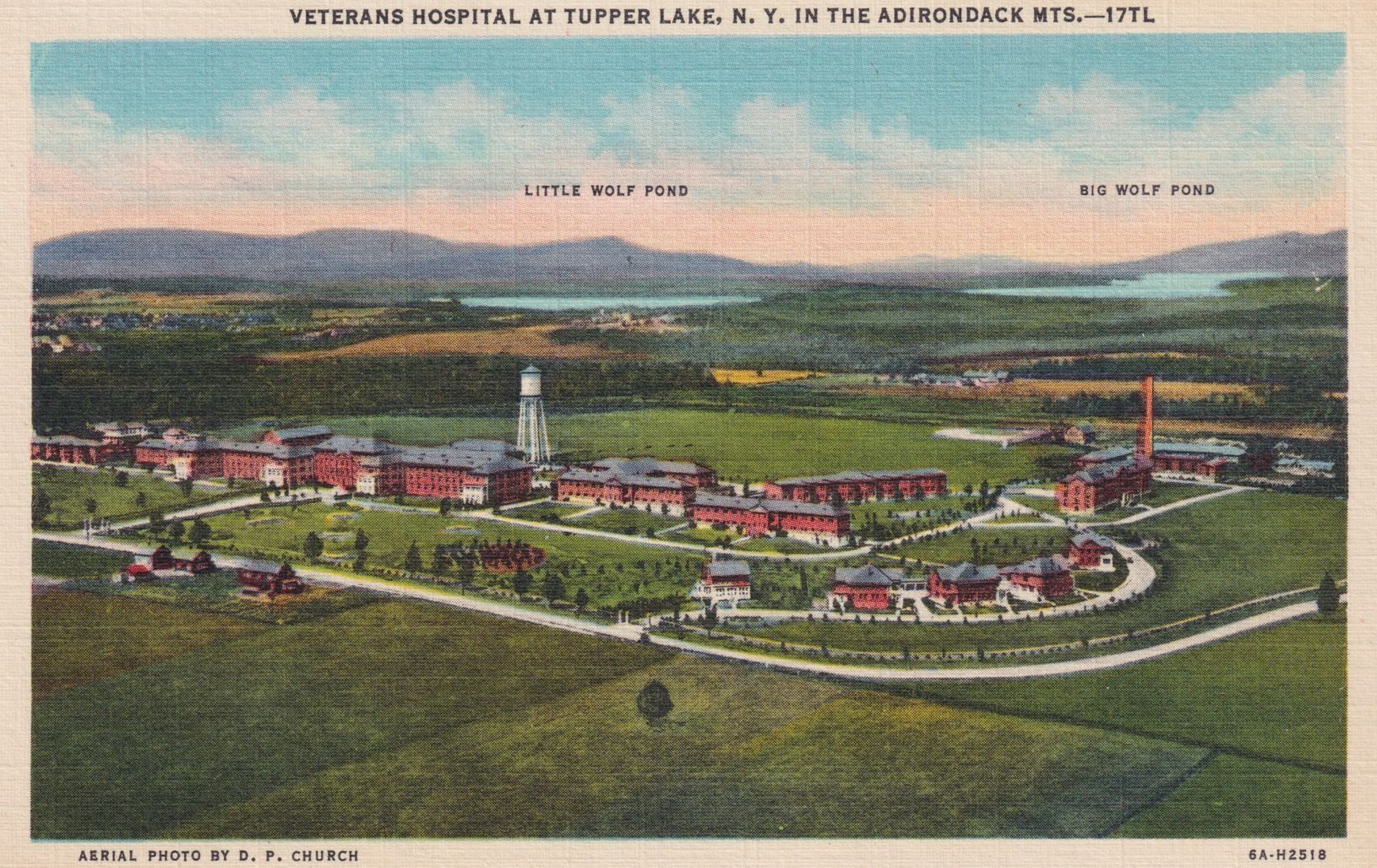 Color linen postcard showing an aerial view of the Veterans Hospital/Sunmount campus. Printed caption on front reads, "Veterans Hospital at Tupper Lake, N. Y. in the Adirondack Mts." Printed by C. W. Hughes & Co., Mechanicville. Photograph by D. P. Church. Unused, divided back, white border.Subject Place