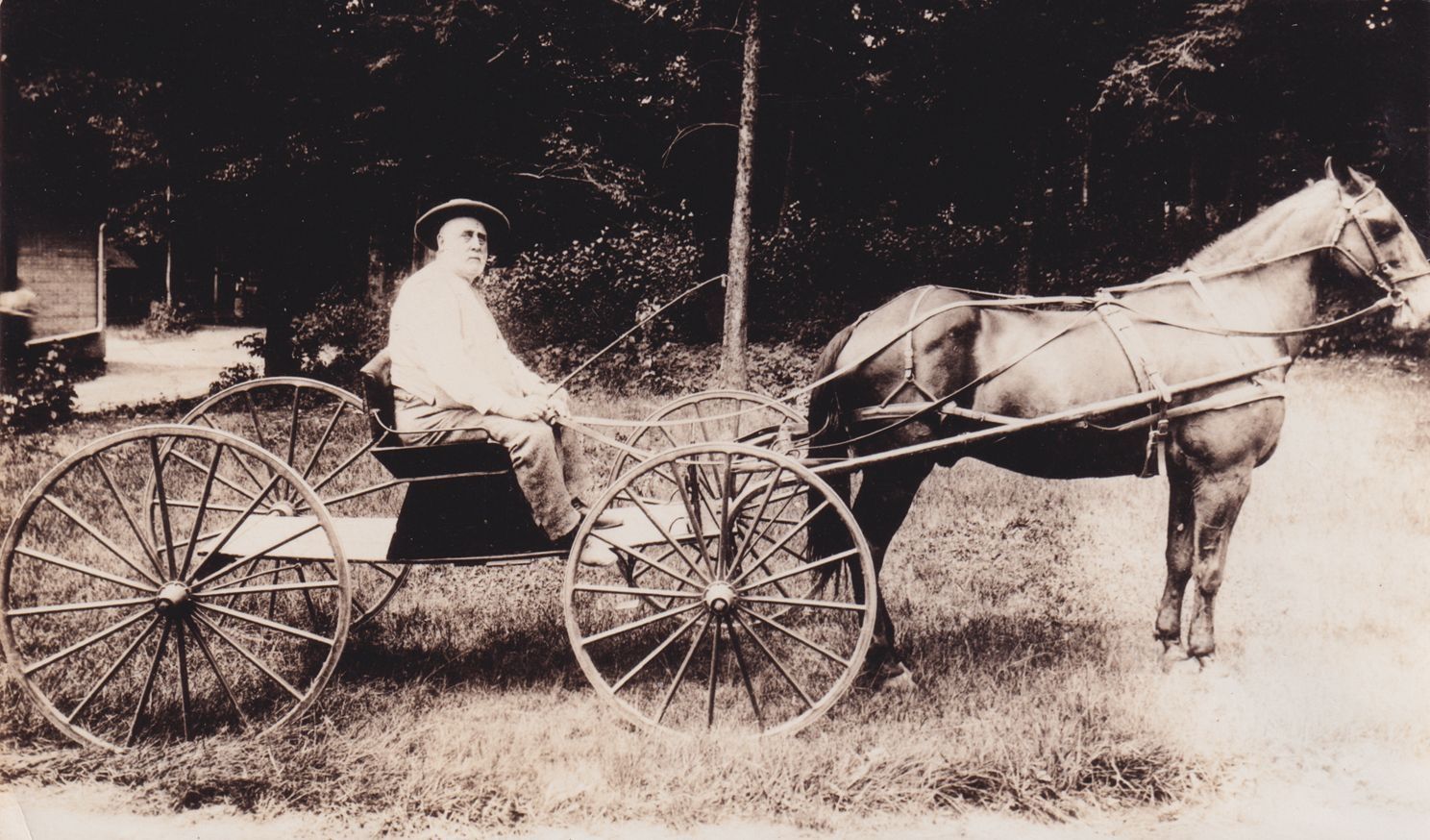 Black and white photograph of a man on a cart attached to a horse. The man is possibly Paul Smith.