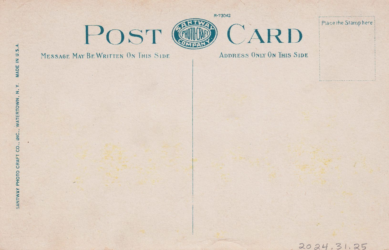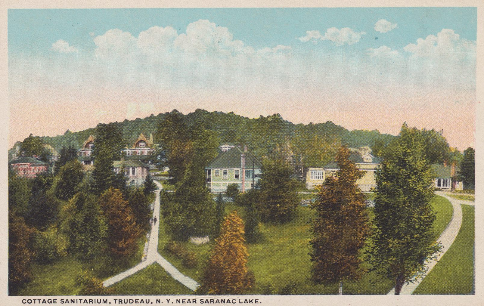 Color postcard showing the view of the Adirondack Cottage Sanitarium (later renamed Trudeau Sanatorium), looking west across the campus. Printed caption on front reads, "Cottage Sanitarium, Trudeau, N. Y. Near Saranac Lake." Printed by the Santway Photo-Craft Co., Inc., Watertown, NY. Unused, divided back, white border.Subject Place
