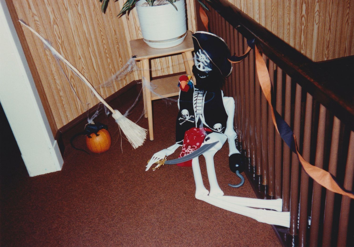Color photograph of a landing decorated for Halloween. There is a fake skeleton dressed up as a pirate leaning against a railing. This photograph is from an album of photographs taken at the American Management Association.