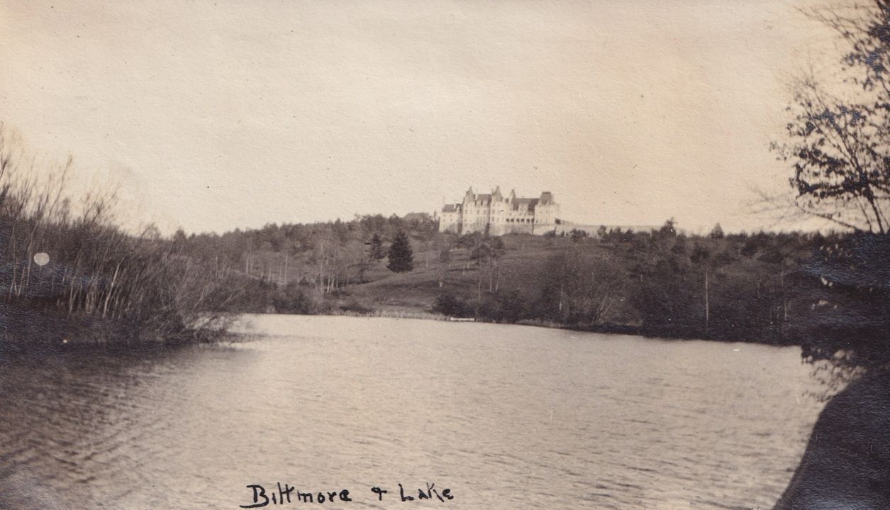 Black-and-white photograph of a lake with trees along the shoreline. Visible above the tree line on the opposite shore from the photographer is the Biltmore Estate, located in Asheville, North Carolina. "Biltmore + Lake" is written in ink at the bottom of the photograph.