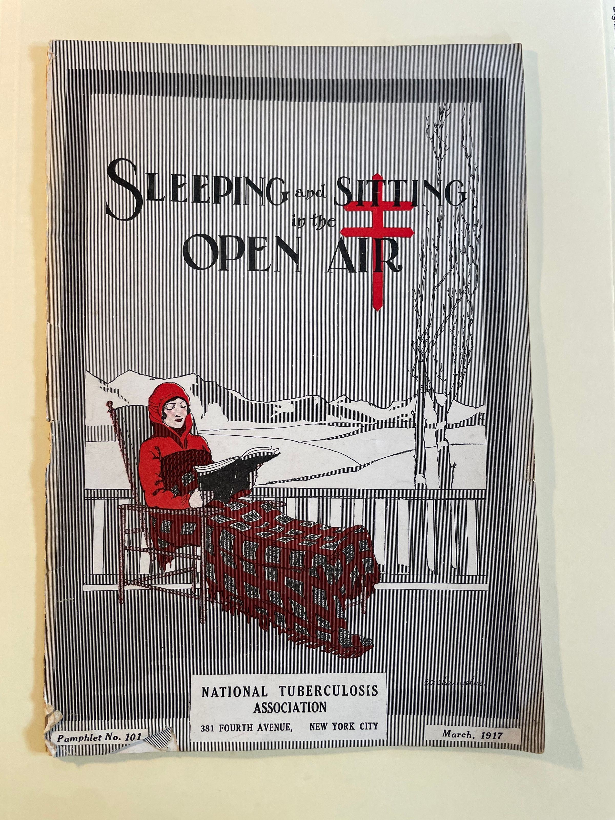 Pamphlet created by the National Tuberculosis Association to promote sleeping and sitting outdoors in the fresh air. Contains information on the value of fresh air, how to access fresh air, designs for porches and other modifications, furniture, supplies, and other items needed for sleeping out. Includes photographs and illustrations. Based off a pamphlet entitled "Directions for Living and Sleeping in the Open Air," by Thomas Spees Carrington, with updates. Originally printed March, 1917, reprinted March, 1919. Cover has drawing of a woman sitting reading in a cure chair with snow-covered mountains behind her.Lexicon