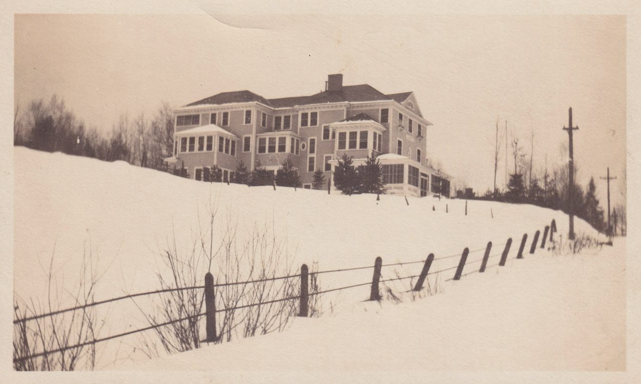 Black-and-White photograph of Sisters Hospital/St. Mary's on the Lake on Ampersand Avenue in the snow. Taken by Harvey Harrison Bird while curing in Saranac Lake, 1920-1921.
