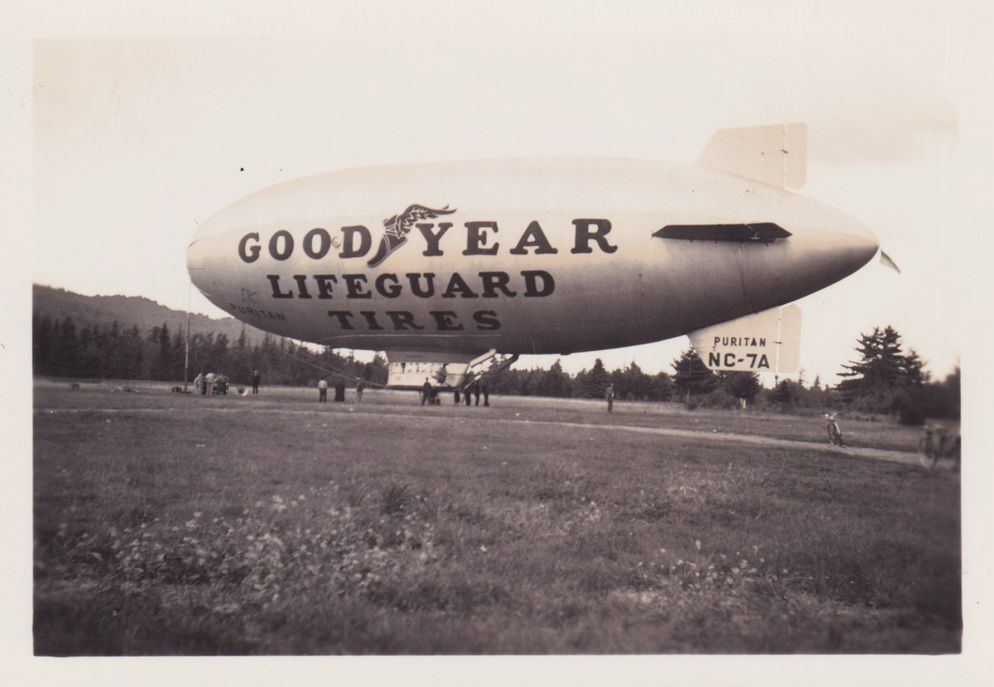 Black-and-White photograph of a Goodyear Blimp docked above a field. Several people can be seen standing around the cockpit. Photograph was likely printed by Kollecker's Kodak and Gift Shop.