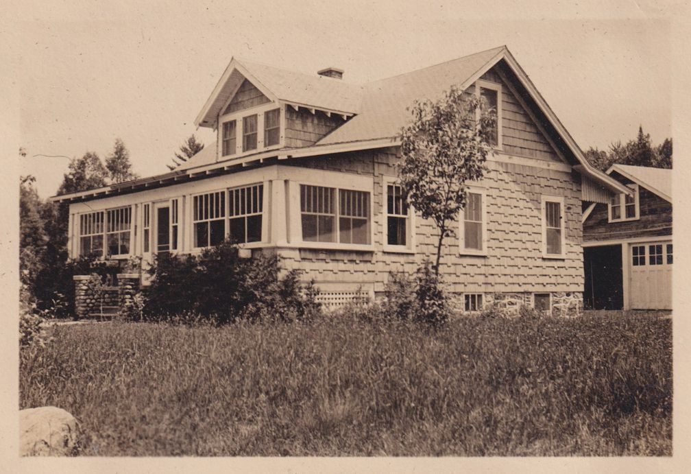 Black-and-White photograph of the second residence of the Jones Family in Saranac Lake, an unidentified cure cottage on Lake Street. It may be 453 Lake Street. Part of album 2024.21.1, kept by Amy Jones and David Blair Jones c. 1930-1934.