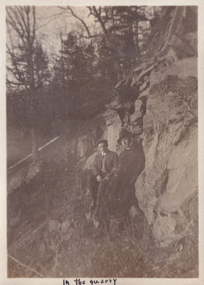 Black-and-white photograph of two men leaning against a natural rocky wall in a wooded area. "In the quarry" is written in ink beneath the photograph.