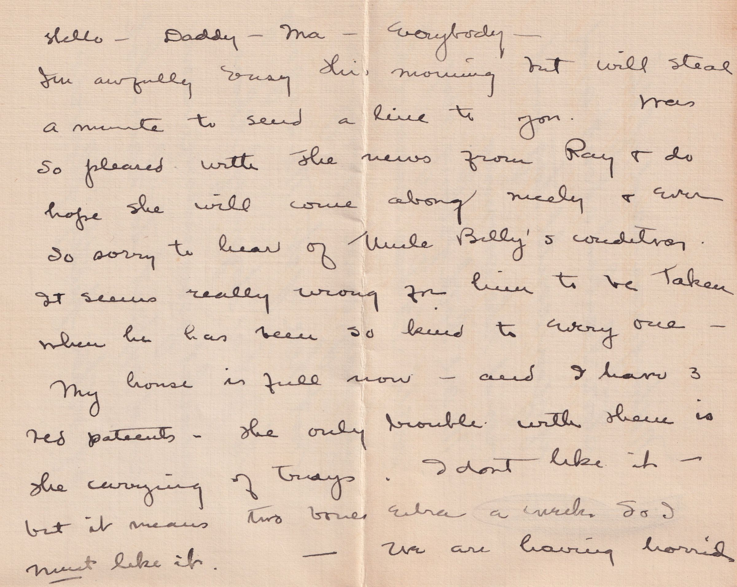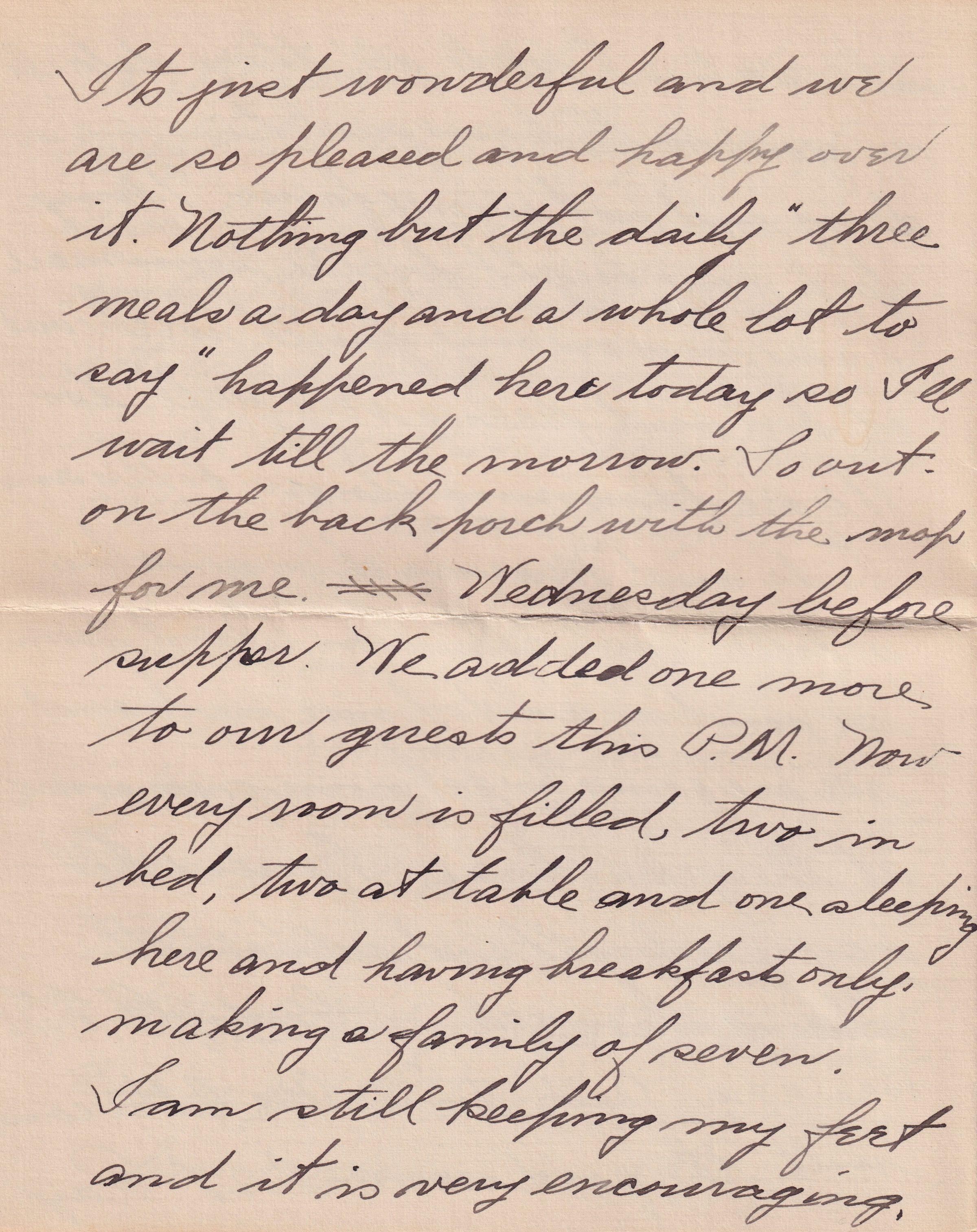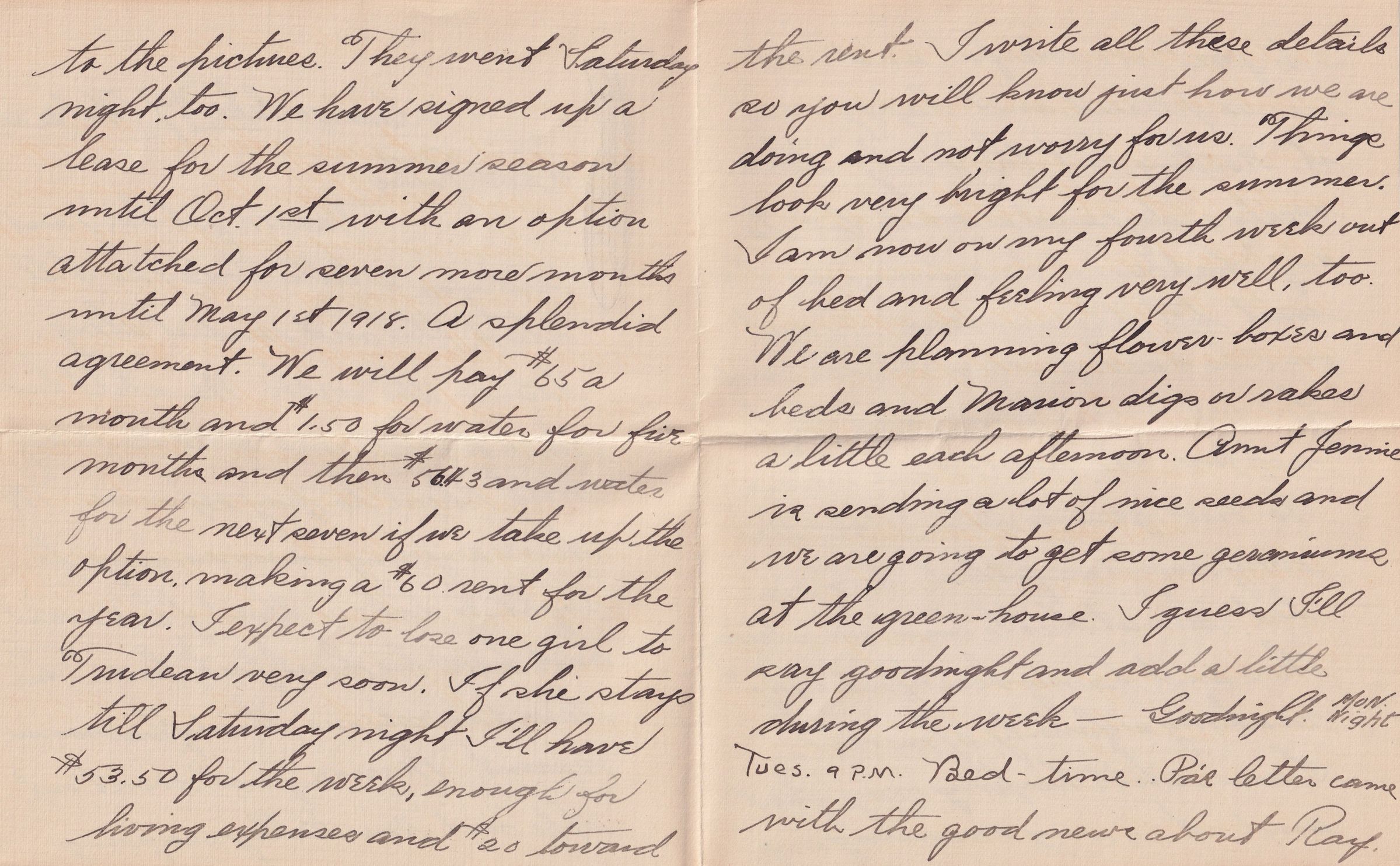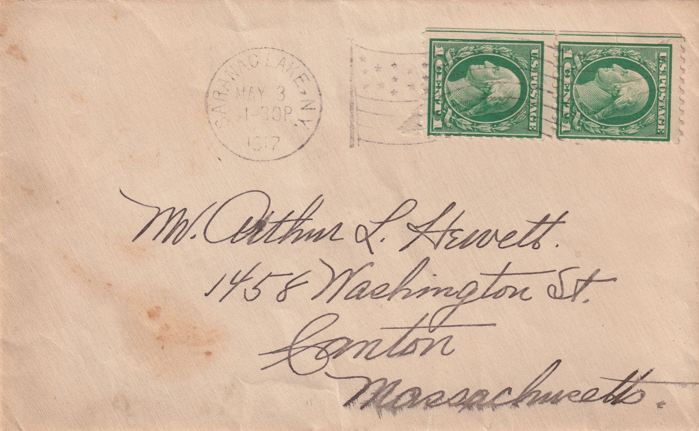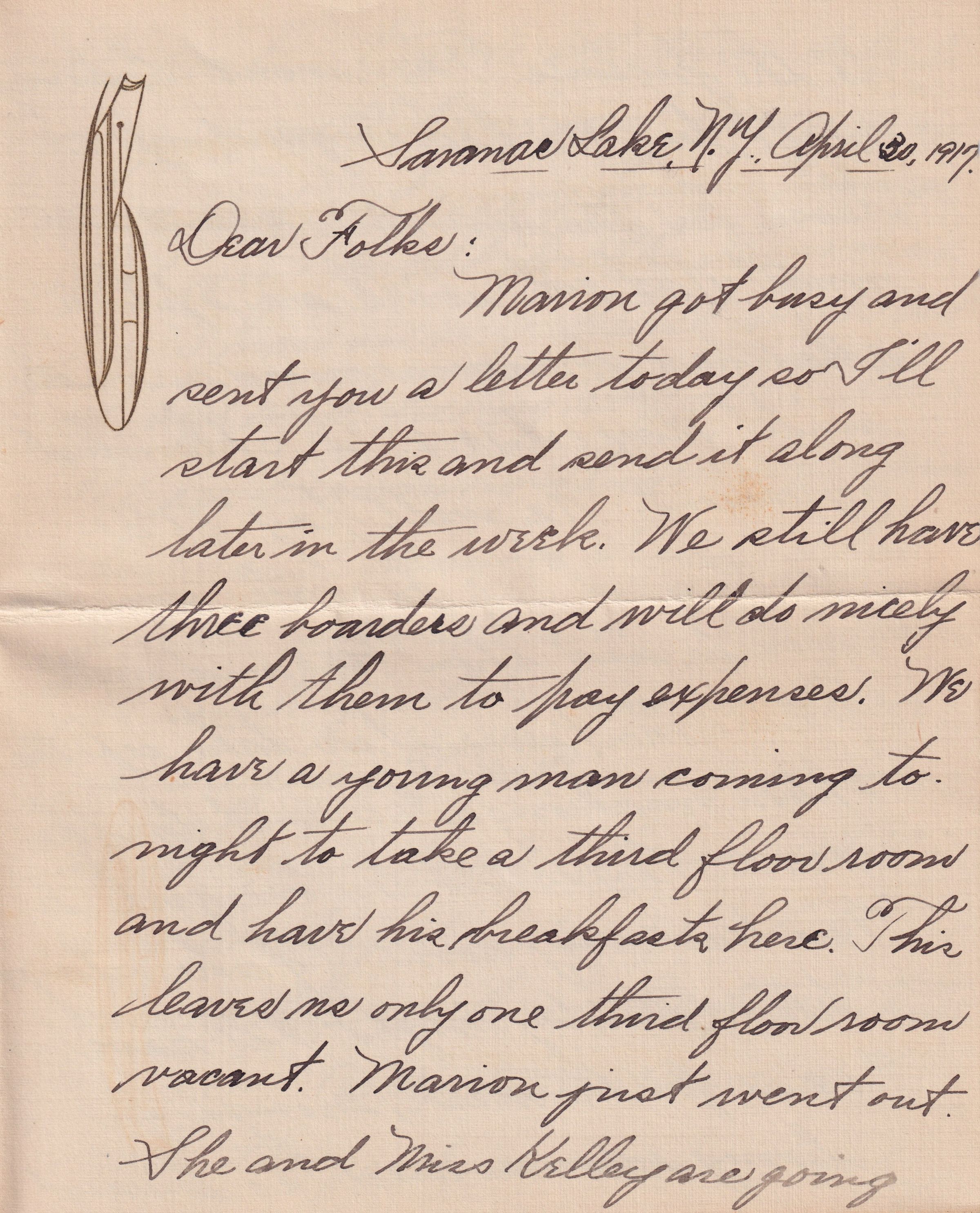 Letter from Elmer and Marion Gunn to "folks," April 30-May 1, 1917. The first 6 pages of the letter were written by Elmer. He discusses their finances, lodgers at their cure cottage, their health, and the costs of living in Saranac Lake. Marion added a page and a half note discussing bringing trays to patients, her family's health, and the weather. 2s, 8p, with an envelope addressed to Arthur L. Hewitt, 1458 Washington Street, Canton, MA. Stationery has EBG monogram. Postmarked Saranac Lake, NY, May 3, 1917, return address of 36 Baker Street, Saranac Lake, NY.
