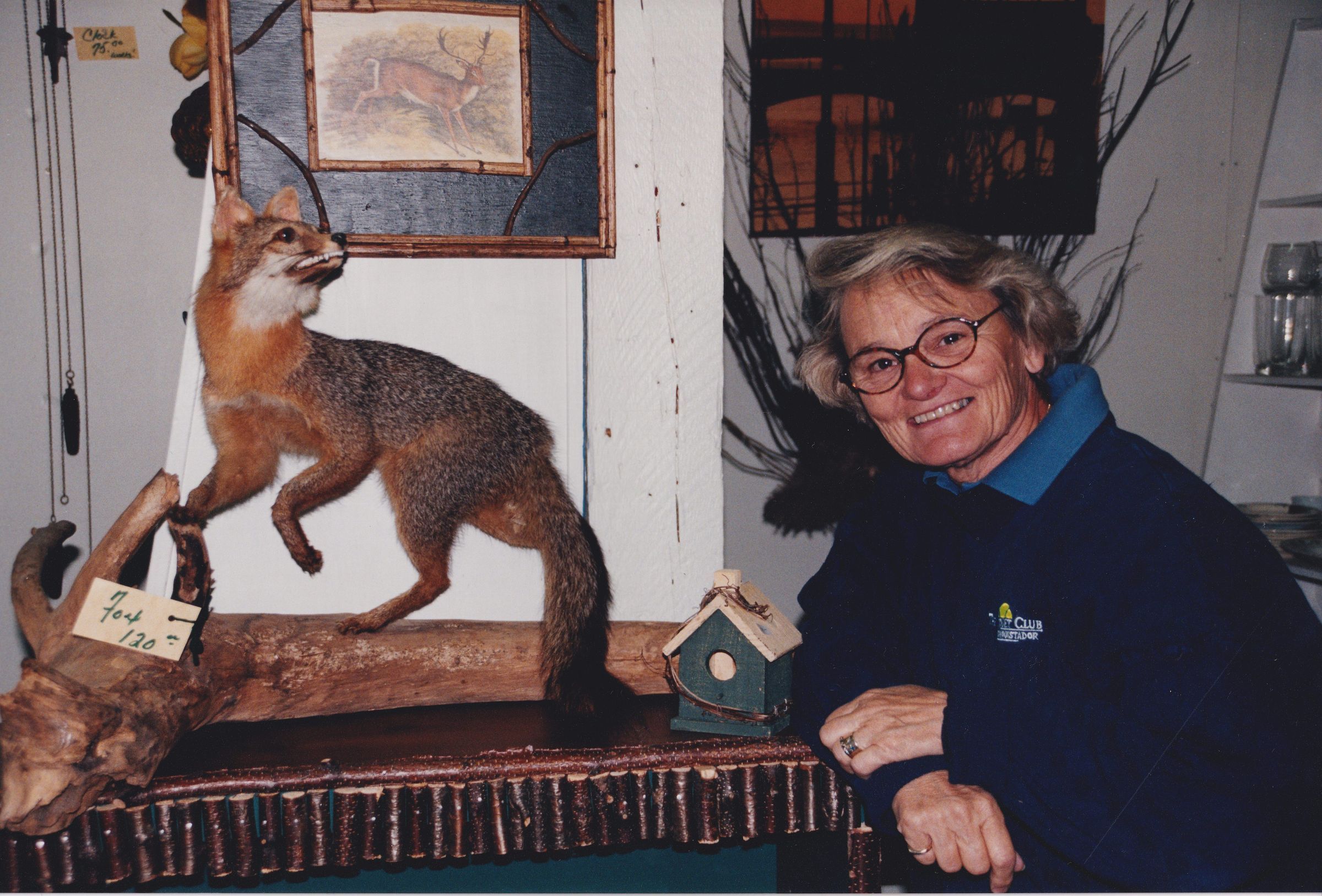 Color photograph of the owner of Cabin Fever Antiques posing next to a taxidermy fox. Portrait taken by Mary Lou Hanpeter Banks as part of her Soul Proprietor exhibition.