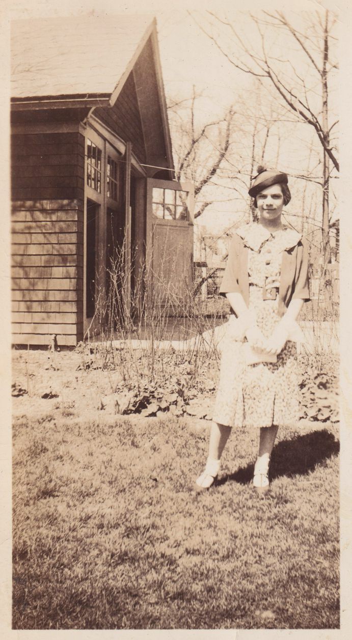 Black-and-White photograph of young Irene Weishal at the home of her grandparents, D. Edward and Abbie Jane Jones. The Jones Family took a long road trip in 1934 that included stopping at Blair's parents' house in LaGrange, IL.