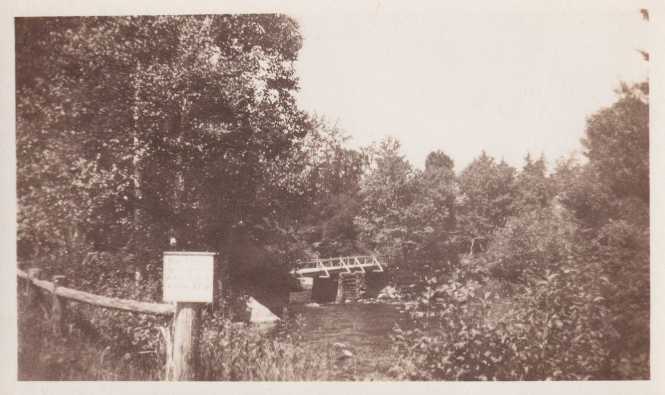 Black-and-White photograph looking up the Saranac River toward the bridge at Bartlett Carry Club. "July 25, 1932," is stamped on reverse.
