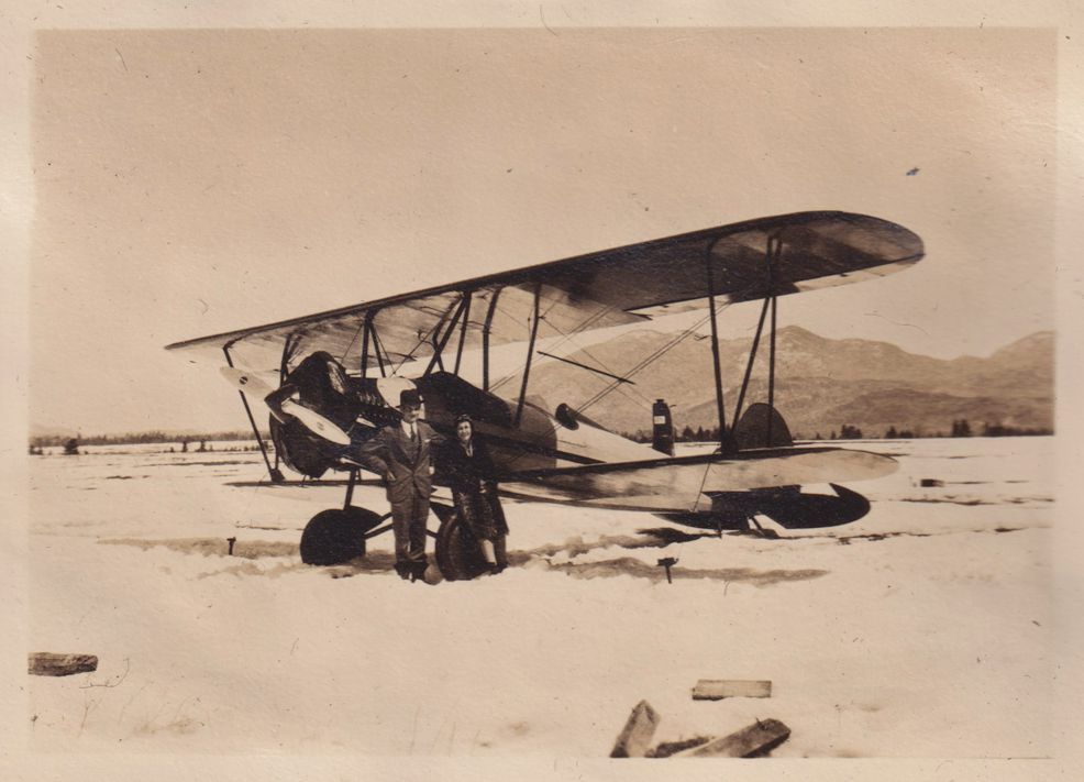 Black-and-White photograph of Amy Jones and an unidentified man standing net to a biplane in the snow at the Lake Placid Airport. Jones is wearing a pilot’s cap and goggles.