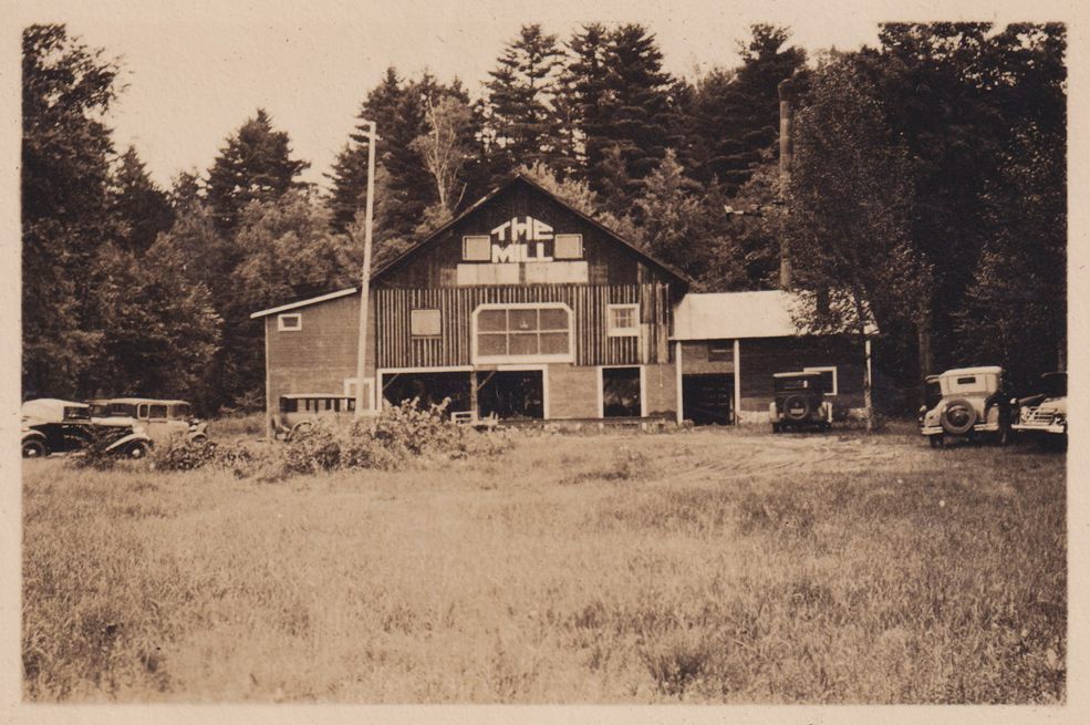 Black-and-White photograph of Wayman Adams' art school studio in Elizabethtown. "The Mill," is painted at the top of a barn-like building. Part of album 2024.21.1, kept by Amy Jones and David Blair Jones c. 1930-1934.