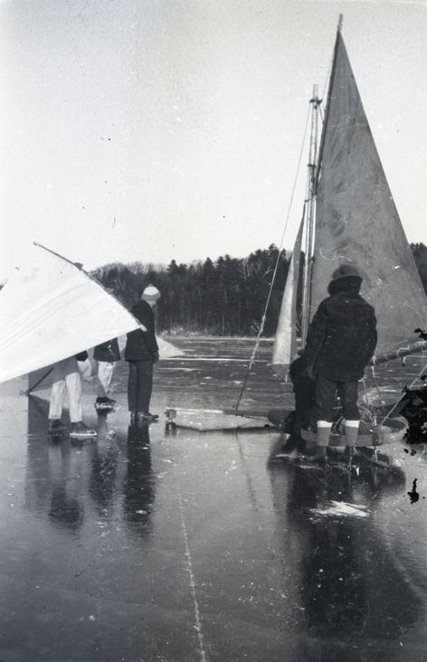 Negative of a group of people standing around an iceboat on a frozen lake. Most likely taken by Mary Ives Baldwin. This item is not fully cataloged but has been uploaded so the image is publicly available; if you would like us to prioritize cataloging this item, please contact the HSL Collections team.