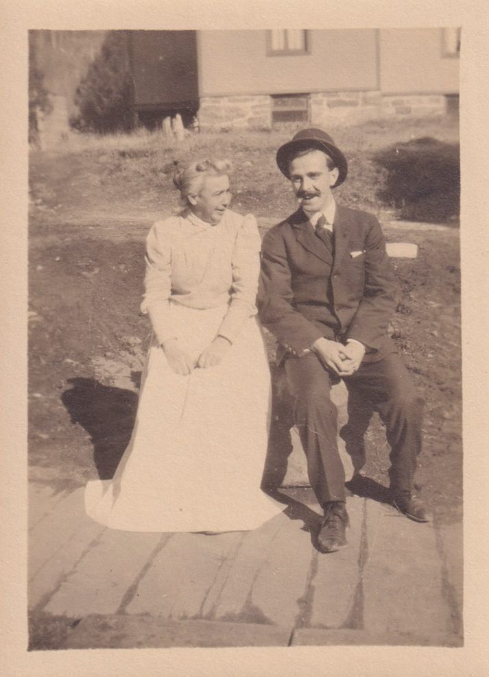 Black-and-White photograph of a man and a woman seated outside on a bench. Was in an envelope marked, "Stickney - Saranac Lake." Photograph was developed by Kollecker's Kodak and Gift Shop.
