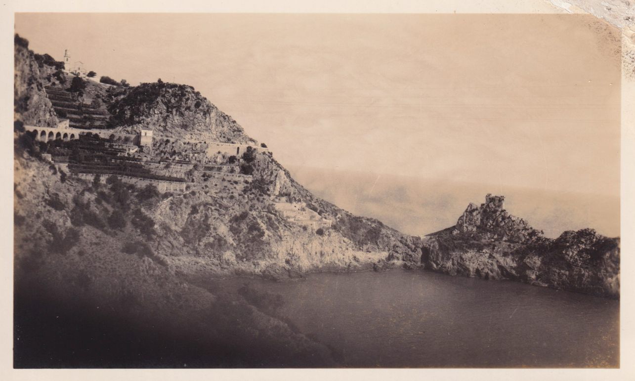 Black-and-White photograph of ruins on a hillside. The photograph was likely taken by a person on vacation in Italy and printed by Kollecker's Kodak and Gift Shop.