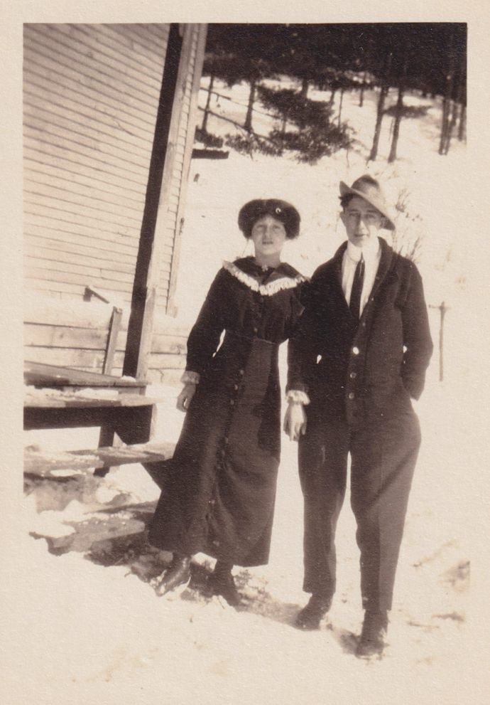Black-and-White photograph of two unidentified people standing in the snow outside of a building. The photograph was likely printed by Kollecker's Kodak and Gift Shop.