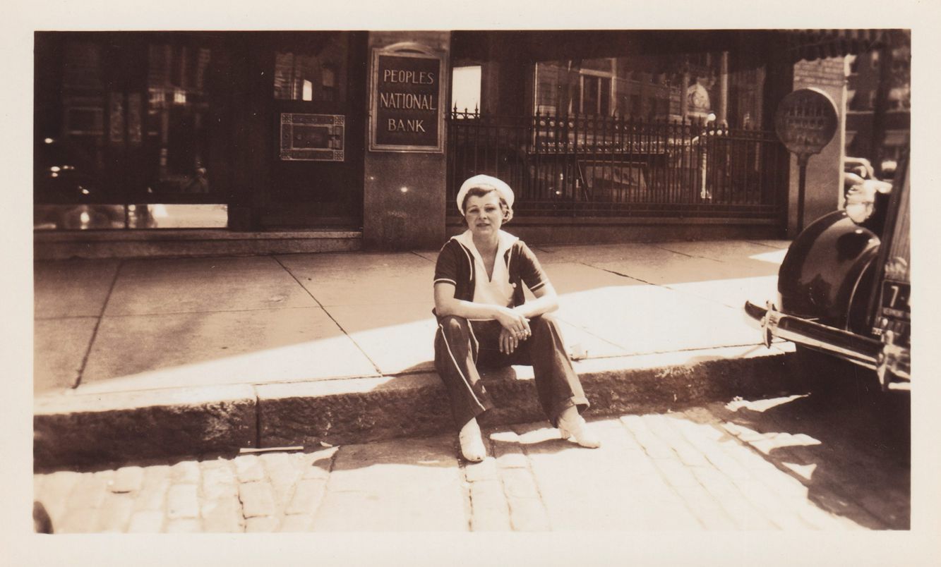 Black-and-White photograph of a woman seated on a curb. The sign on the building behind her reads, "People's National Bank." Was in an envelope marked, "Hoffman, Monday Jul 12 1937." Photograph was developed by Kollecker's Kodak and Gift Shop. Negative is 2024.2.36.16.Lexicon