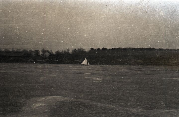 Negative of a sailboat out on a lake. Trees on the shoreline stand behind the boat. Most likely taken by Mary Ives Baldwin. This item is not fully cataloged but has been uploaded so the image is publicly available; if you would like us to prioritize cataloging this item, please contact the HSL Collections team.