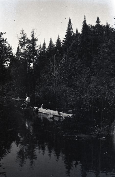 Negative of an unidentified man holding an oar and standing in a canoe on a lake. There is a floating log next to him. Most likely taken by Mary Ives Baldwin. This item is not fully cataloged but has been uploaded so the image is publicly available; if you would like us to prioritize cataloging this item, please contact the HSL Collections team.