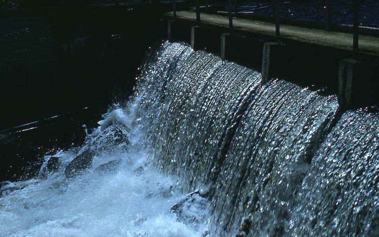 Color Kodachrome slide showing a dam. Handwritten note on front reads, "Spillway from Upper Saranac." From a group of vacation slides taken by an unidentified family.