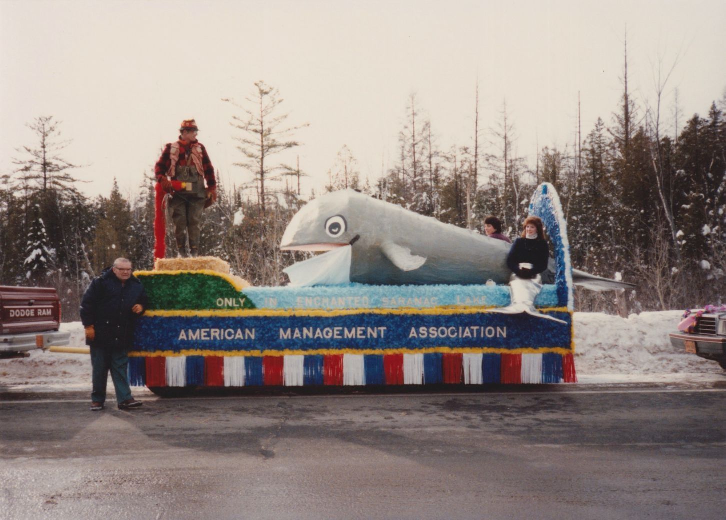 Color photograph of a Winter Carnival float shaped like a whale partially out of the ocean. The bottom of the float reads "Only in Enchanted Saranac Lake" and underneath that "American Management Association." There are four people on or next to the float. This photograph is from an album of photographs taken by staff of the American Management Association.