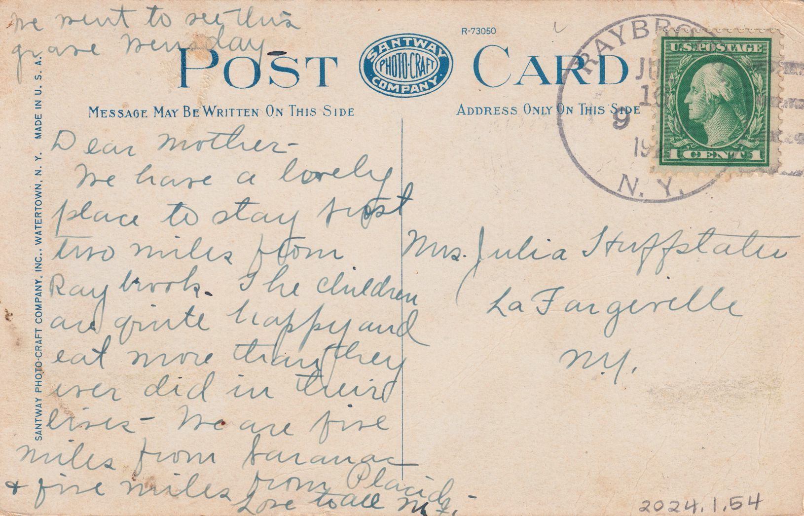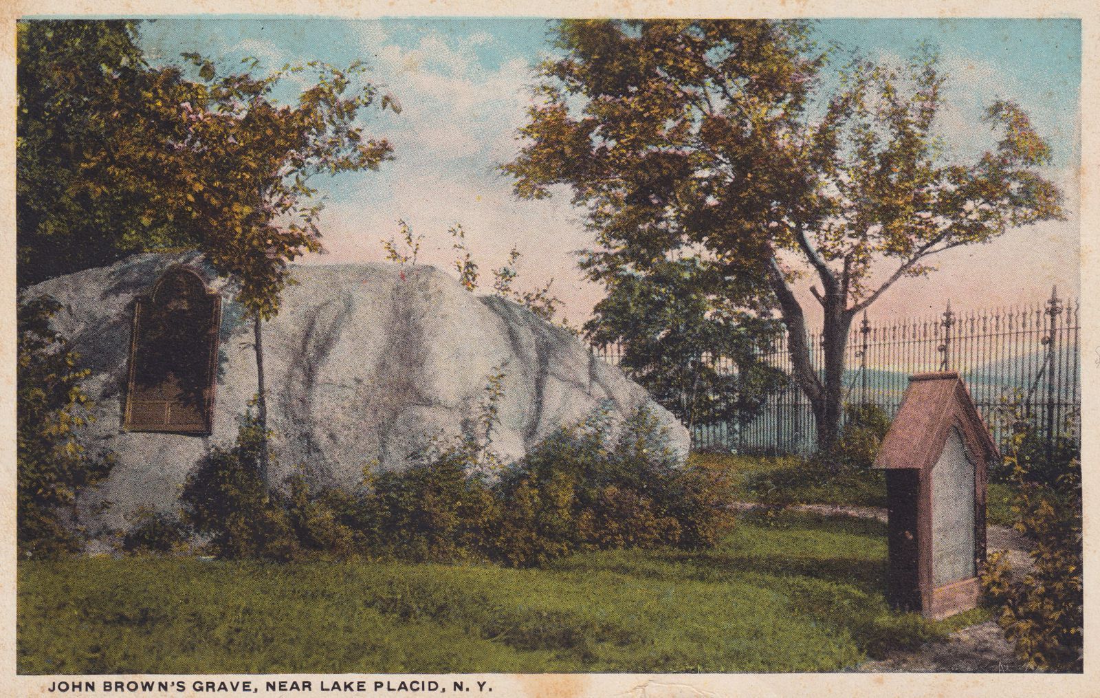 Color postcard showing a gravestone in front of a large boulder. Printed caption on front reads, "John Brown's Grave, Near Lake Placid, N. Y." Printed by Santway Photo-Craft Company, Inc., Watertown, NY. Used, divided back, white border, postmarked Ray Brook, NY, July 16, 1921. Handwritten message on back reads, "Dear Mother - We have a lovely place to stay just two miles from Ray Brook. The children are quite happy and eat more than they ever did in their lives. We are five miles from Saranac & five miles from Placid. Love to all, M.J. We went to see this grave Wednesday." Mailed to Mrs. Juilia Hufpstater [?], LaFargeville, NY.Subject Place