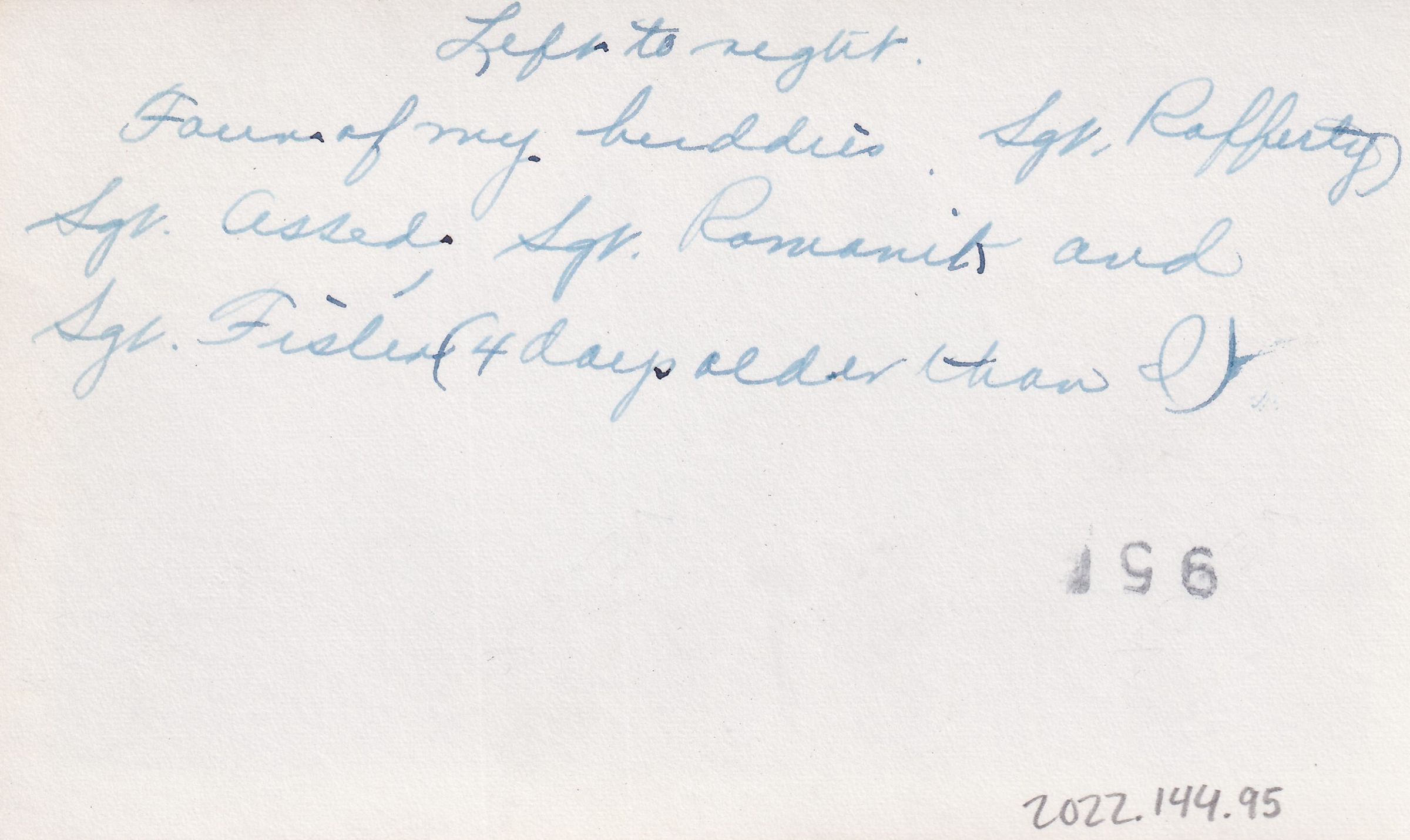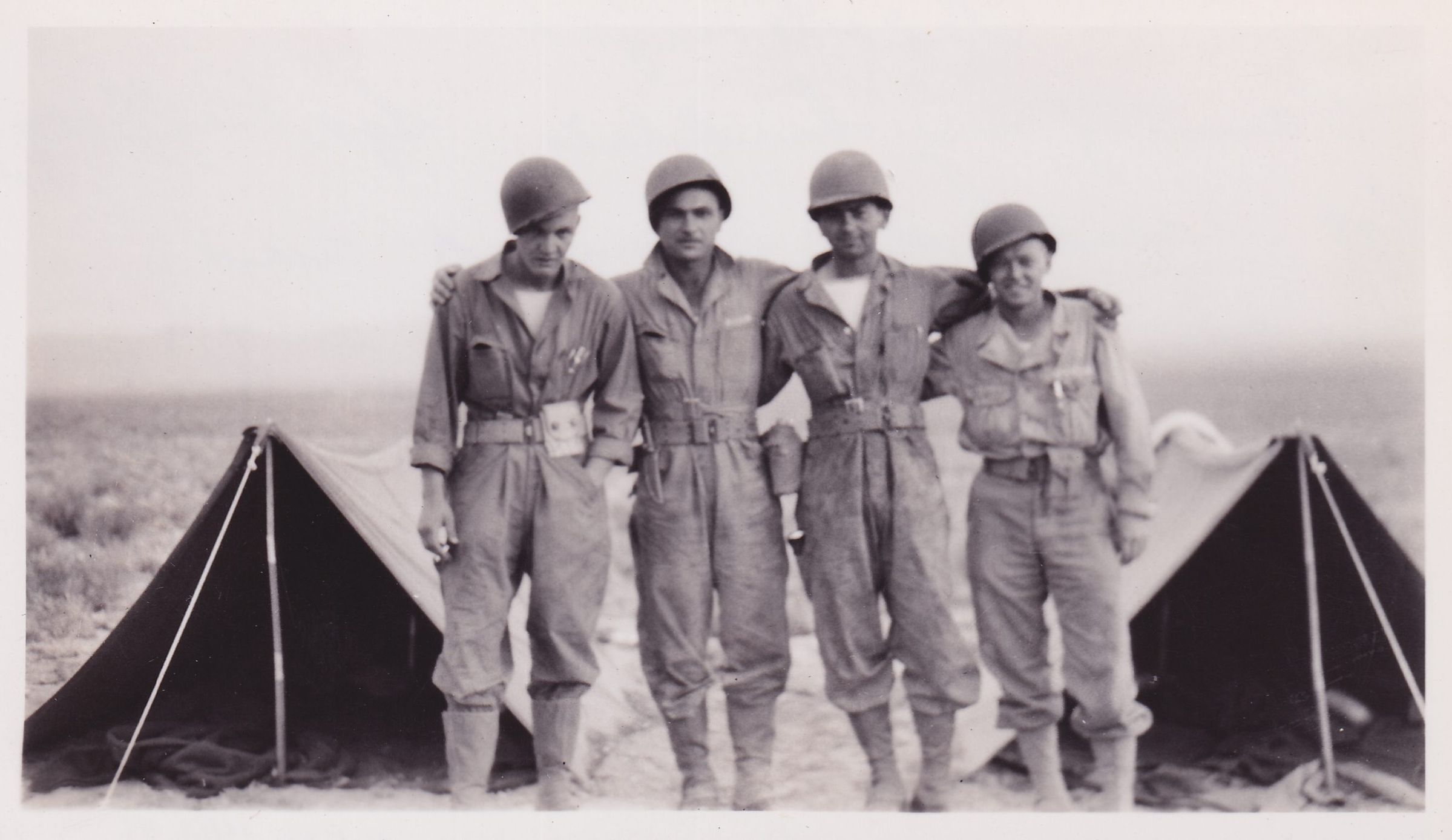 Black-and-White photograph of four soldiers in uniform, standing between two canvas tents. Handwritten caption on back reads, "Left to right. Four of my buddies. Sgt. Rafferty, Sgt. Assed, Sgt. Romanik, and Sgt. Fisler (4 days older than I)."Lexicon