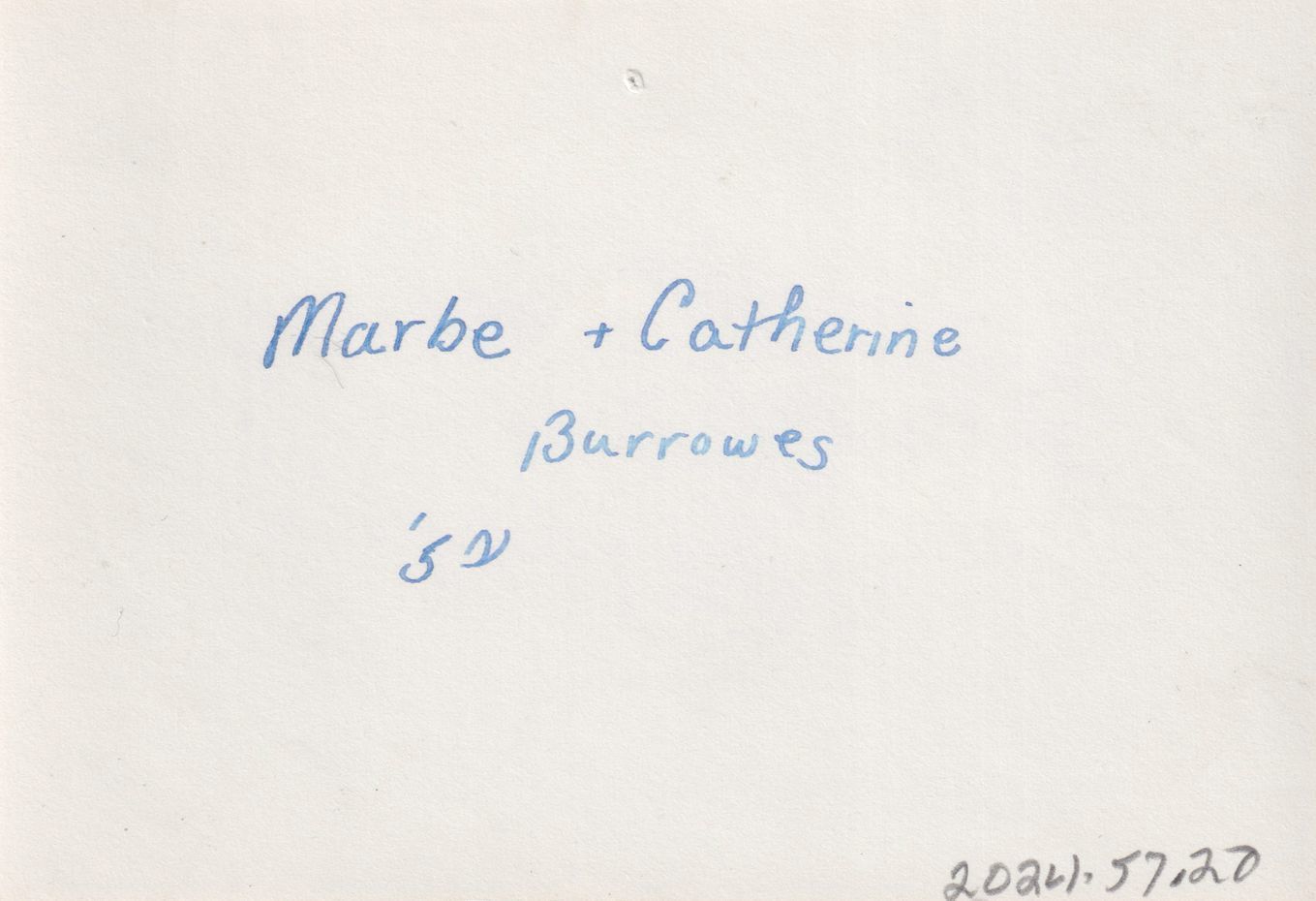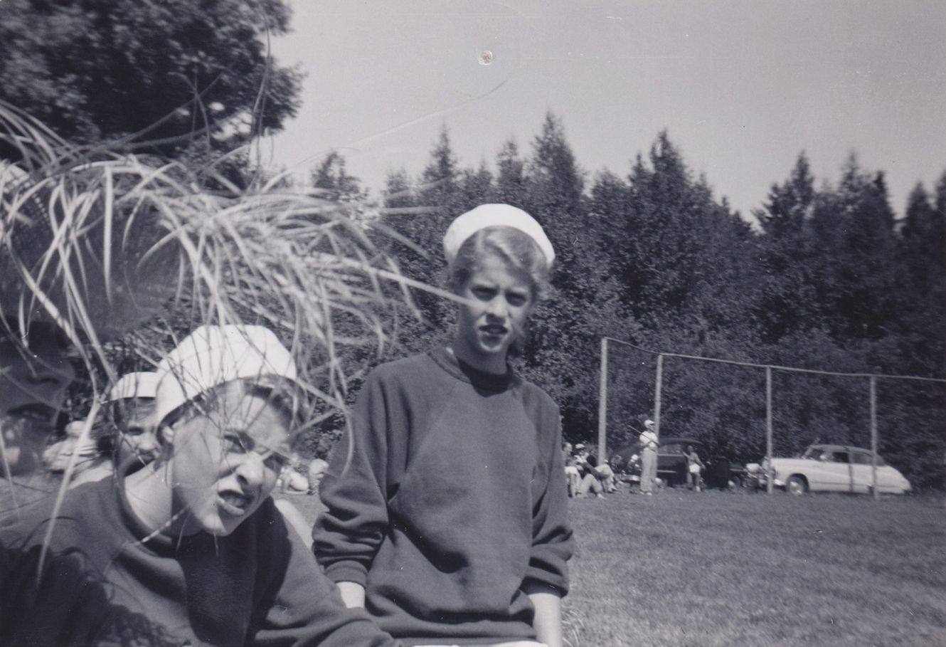 Black-and-White photograph of two young women in matching large sweatshirts and swim or sailor's caps. One of them is holding up a straw cap and peering through it. The baseball diamond at Pyramid Camp (AKA Bartlett Carry Club) can be seen behind them. Handwritten caption on reverse reads, "Marbe + Catherine Burrowes, 52."