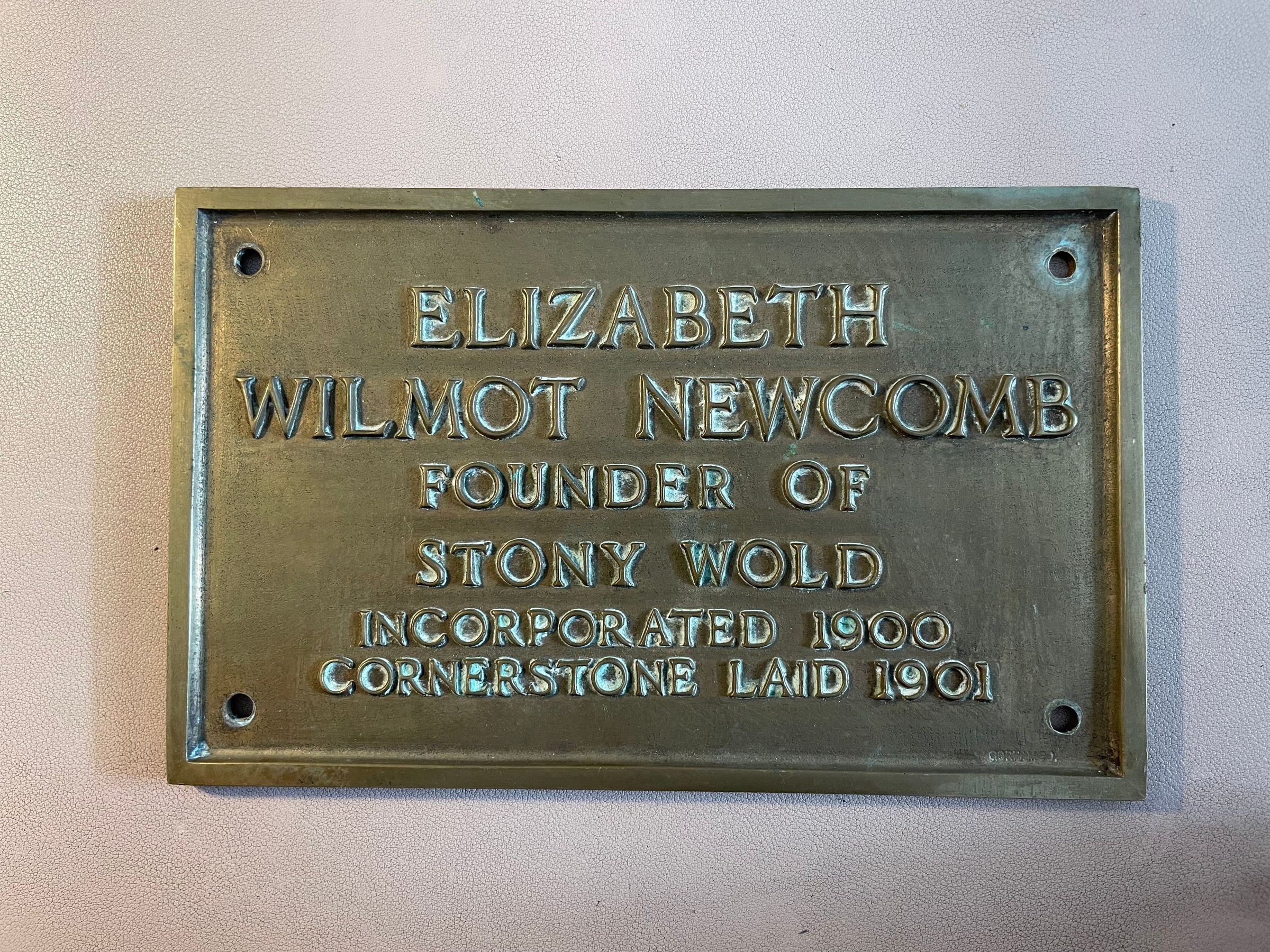 Bronze plaque reading, "Elizabeth Wilmot Newcomb, Founder of Stony Wold, Incorporated 1900, Cornerstone Laid 1901." Plaque is stamped "Gorham 00 [?]" in bottom right corner. Has mounting holes in four corners. Reverse is blank.