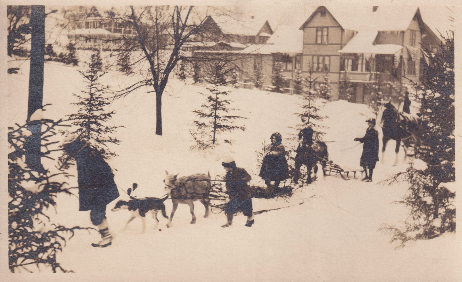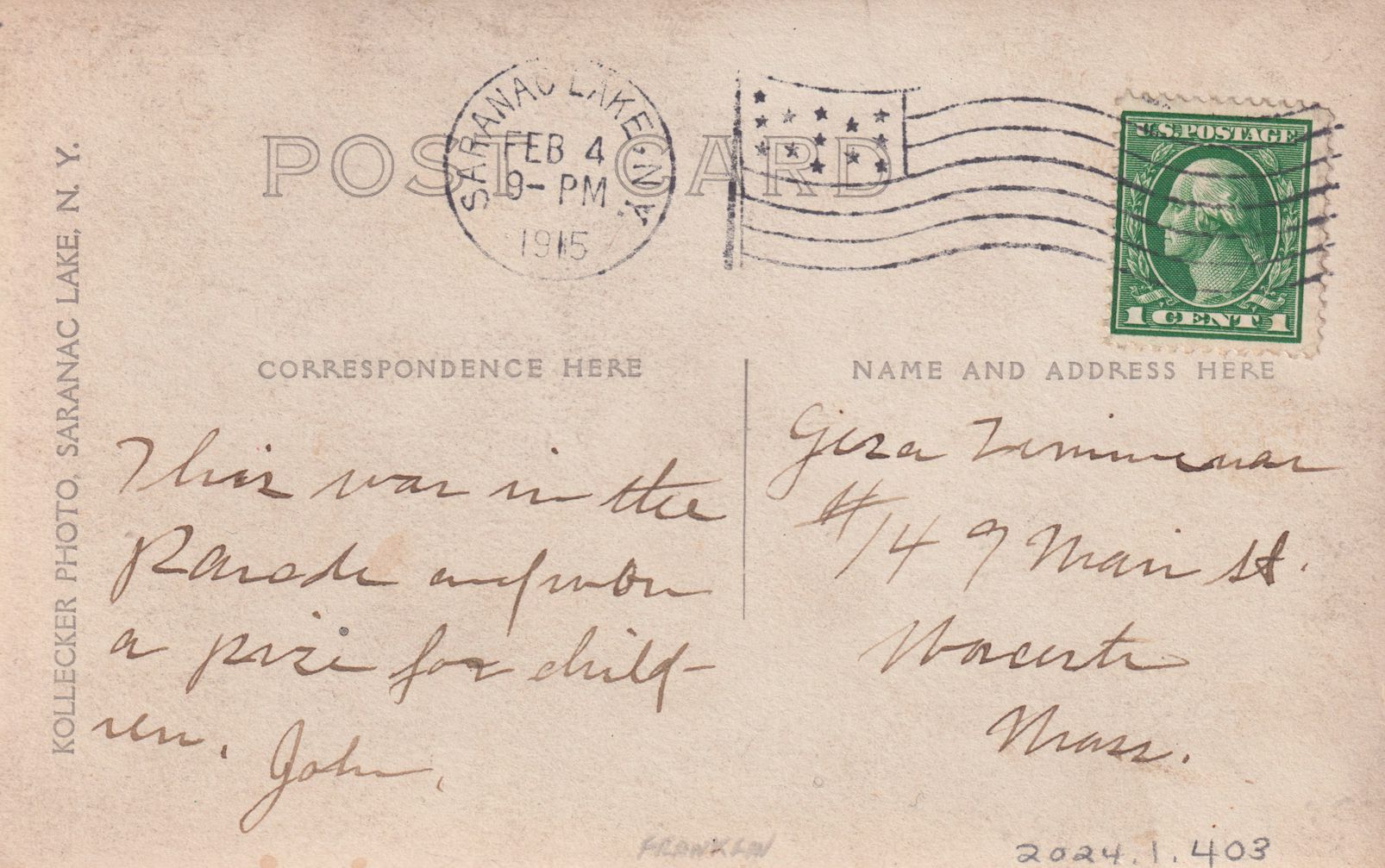 Postcard with a Kollecker photograph of a sled pulled along a path by a dog and a goat. The postcard is addressed to Gina Zimmerman.