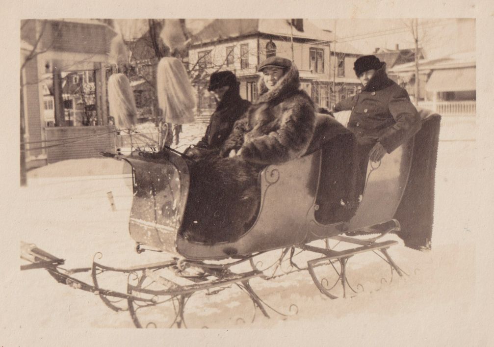 Black-and-white photograph of three people in a sleigh on a snow-covered road. There are cure cottages in the background behind them.
