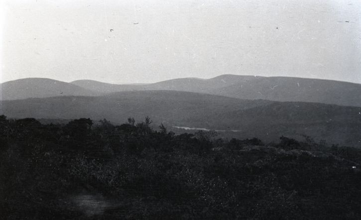 Negative taken from the top of a mountain or overlook looking out to other mountains in the distance. Most likely taken by Mary Ives Baldwin. This item is not fully cataloged but has been uploaded so the image is publicly available; if you would like us to prioritize cataloging this item, please contact the HSL Collections team.
