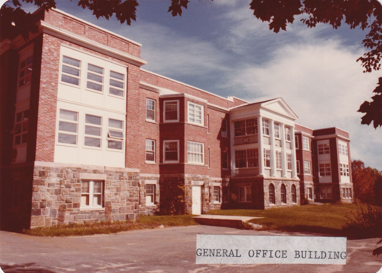 Color photograph of the Ethel Saltus Ludington Memorial Infirmary at Trudeau Sanatorium, taken when the grounds were owned and used by the American Management Association. There is a label affixed to the front of the photograph that has "General Office Building" typewritten on it.