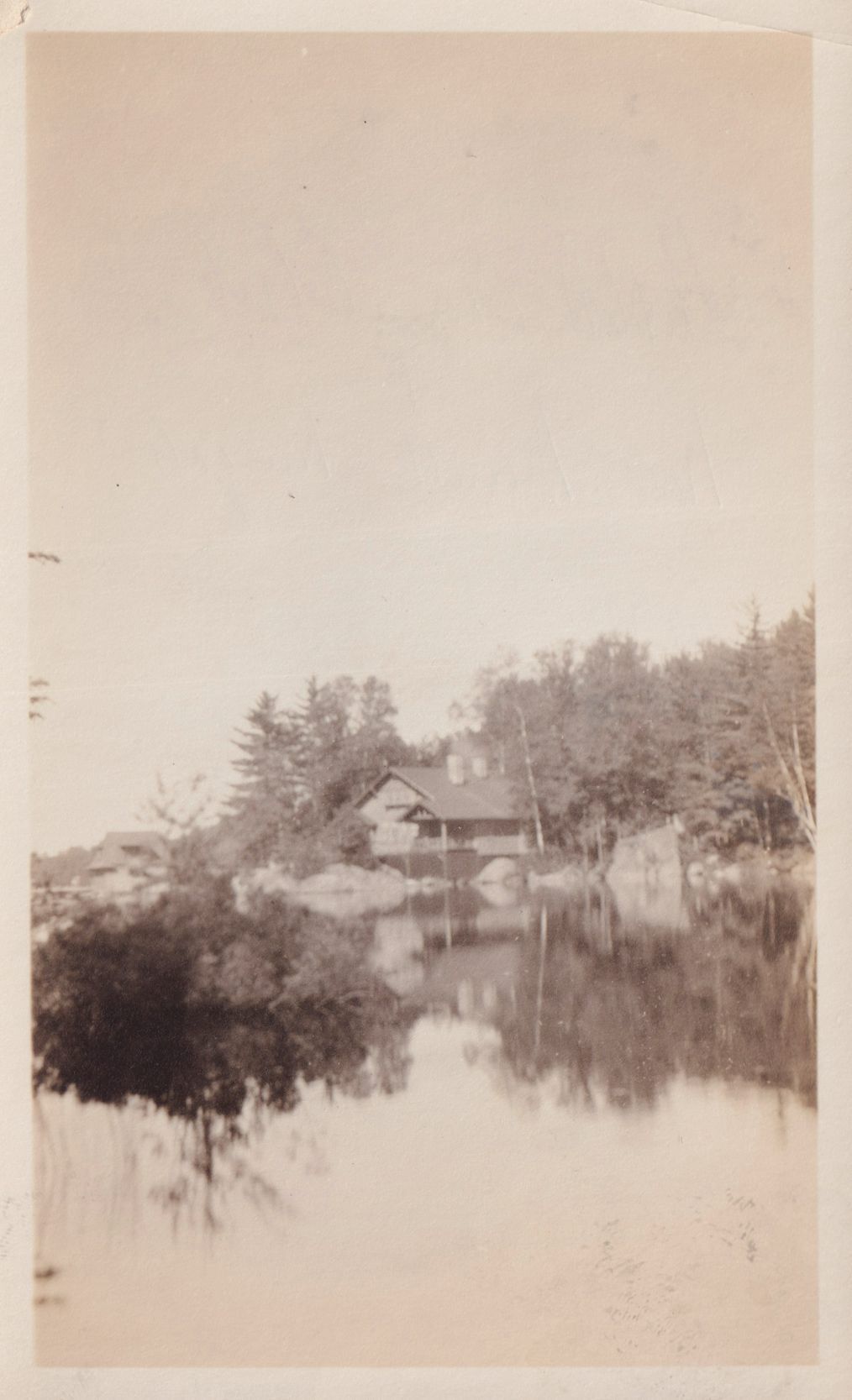Black-and-White photograph of a building on the edge of the water at Bartlett Carry Club. Handwritten note on reverse reads, "Bartlett Carry Club - New Merritt Bungalow. 1926."