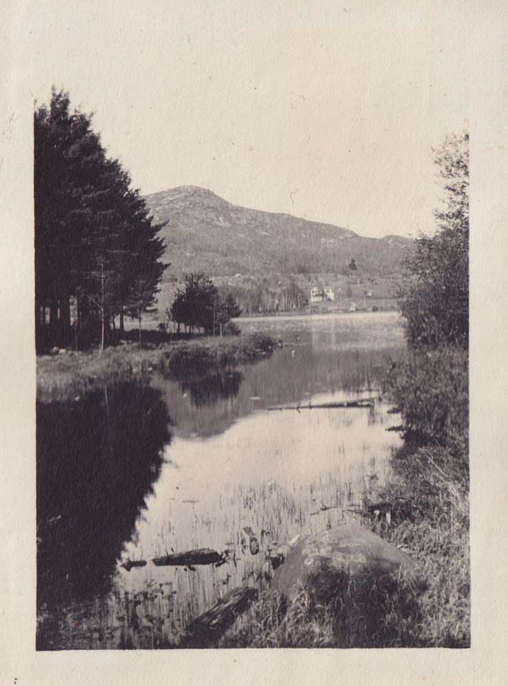 Black-and-white photograph of a lake, taken from an inlet with two shorelines visible. Both shorelines have lots of plant and tree growth on them. There is a field, house, and mountain visible on the far shoreline out of the inlet.