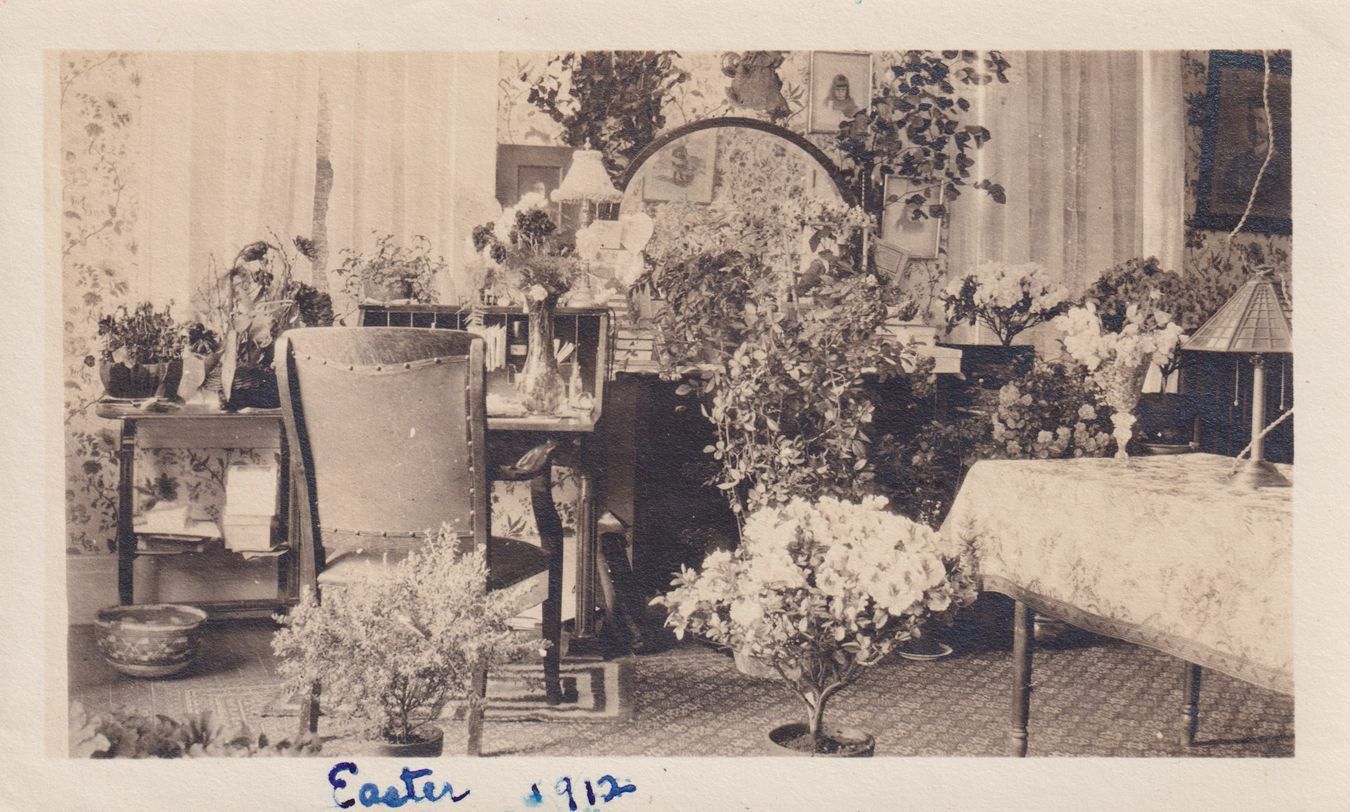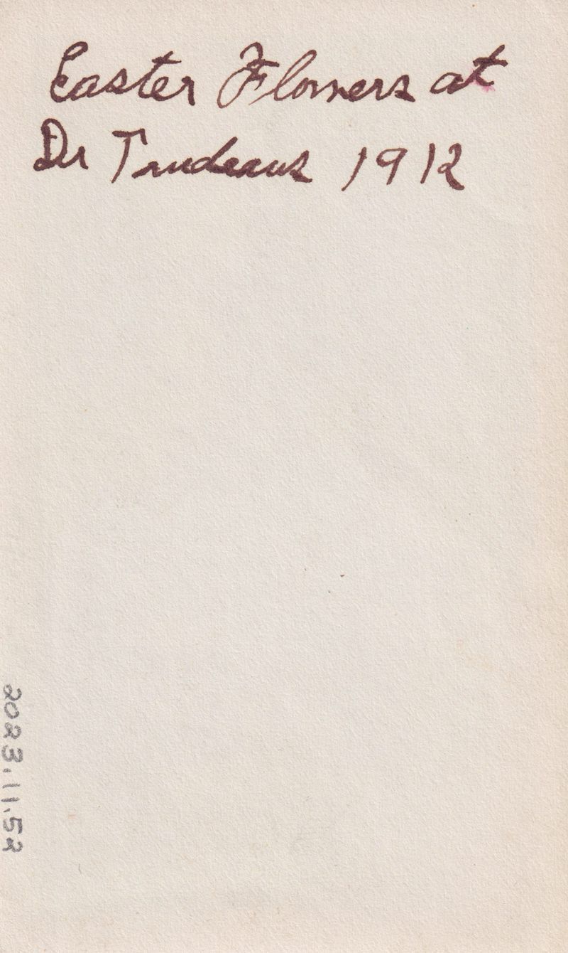 Black-and-White photograph of Dr. Edward Livingston Trudeau’s bedroom at 105 Main Street [now 118 Main Street]. The room is full of vases and planters full of flowers and plants. Handwritten caption on bottom reads, “Easter 1912,” and in a different hand on reverse reads, “Easter Flowers at Dr. Trudeau’s 1912.”