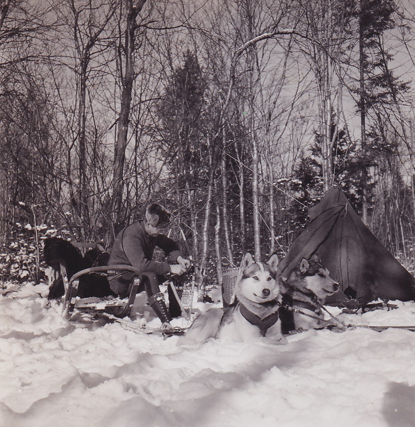 Black-and-White photograph of a man in a game warden uniform seated on a dogsled. There are two sled dogs laying in the snow in front of him, and a tent in the background.