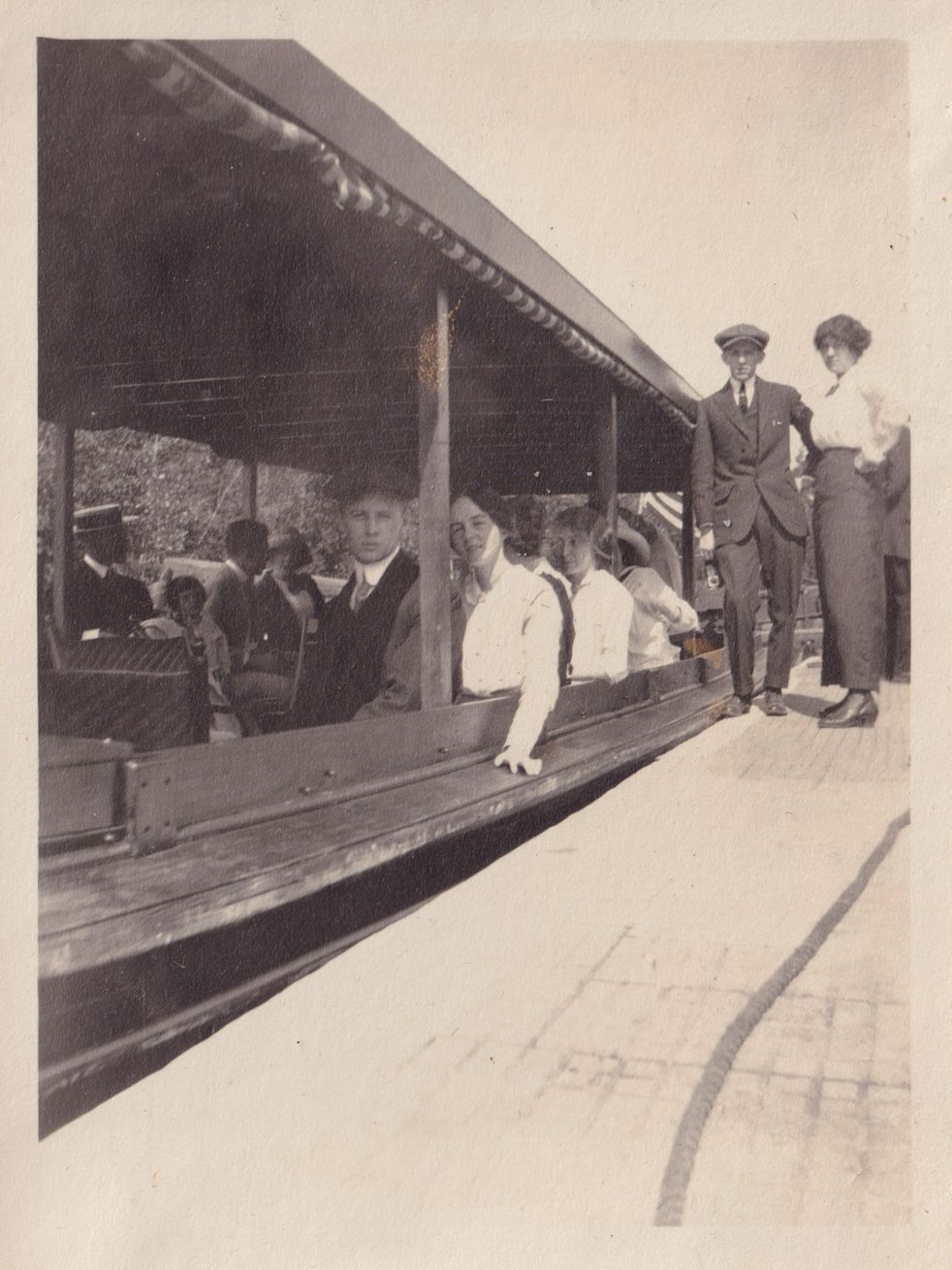 Black-and-white photograph of a group of people sitting on a ferry or other touring boat. There is a man and a woman standing on the dock next to the boat.