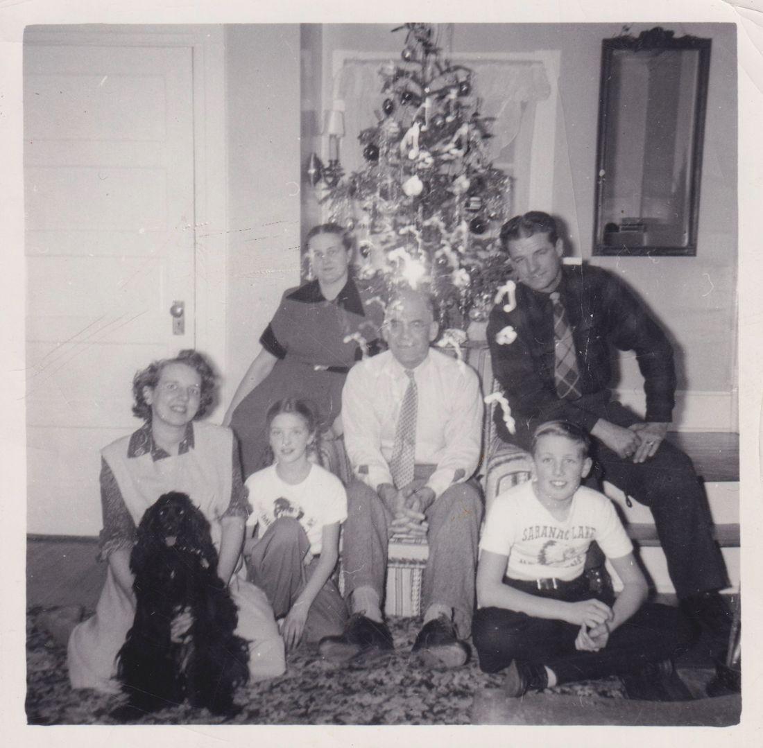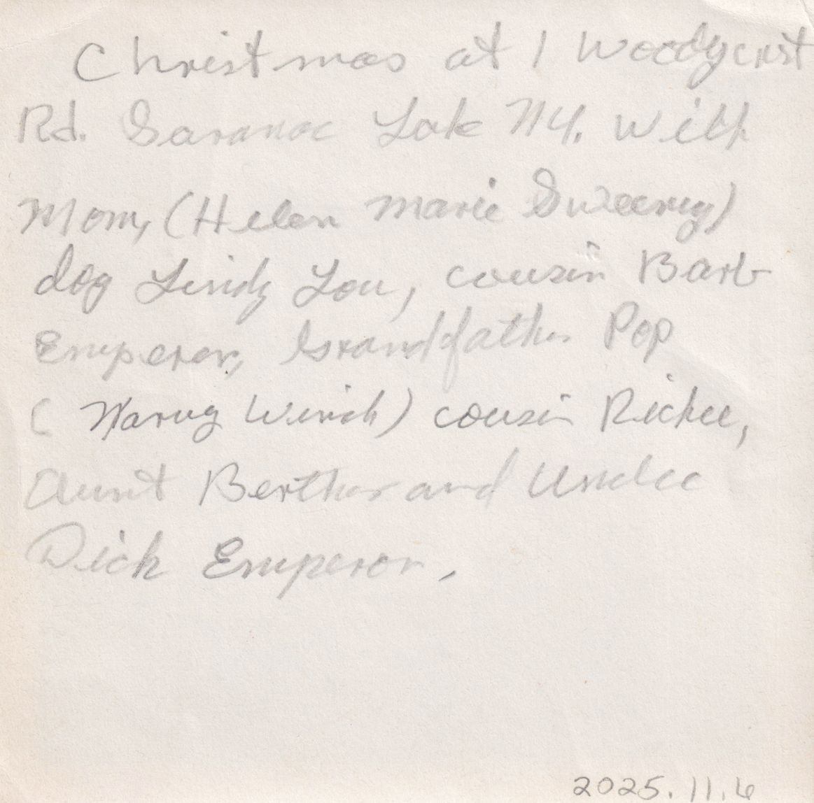 Black-and-White photograph of the Winch/Emperor Family at Christmastime. They are all seated in front of a Christmas tree at 1 Woodycrest Road [now 53 Woodycrest Road]. Harvey Winch is seated at center, Helen Marie Sweeney is seated on the floor holding dog Lindy Lou. Barbara and Richie Emperor are seated on either side of Harvey. Their parents, Bertha and Dick Emperor, are leaning on the chair on either side of Harvey. Handwritten caption on reverse reads, "Christmas at 1 Woodycrest Rd. Saranac Lake, N. Y. with mom (Helen Marie Sweeney), dog Lindy Lou, cousin Barb Emperor, grandfather Pop (Harvey Winch), cousin Richie, Aunt Bertha and Uncle Dick Emperor."Photograph Details