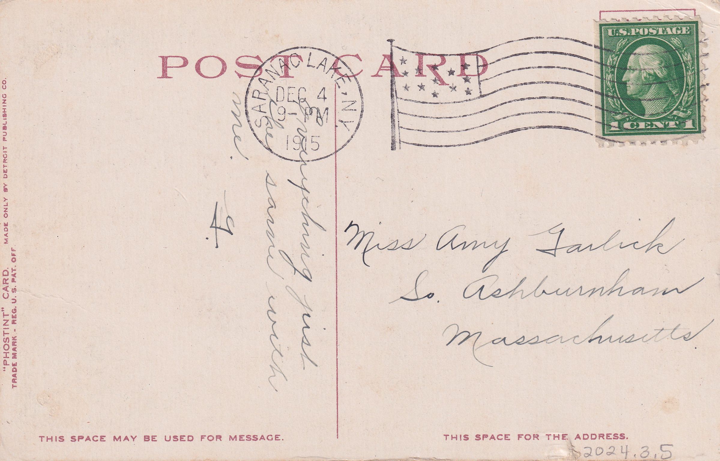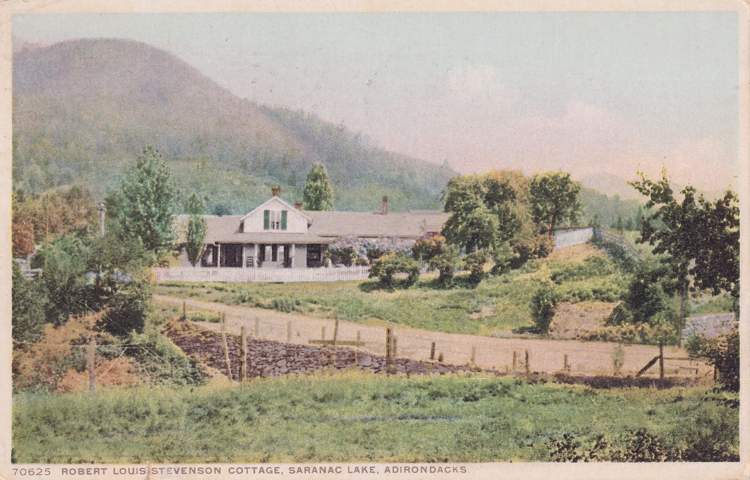 Color postcard showing a view of the Baker Cottage, AKA the Robert Louis Stevenson Cottage. Printed caption on front reads, "Robert Louis Stevenson Cottage, Saranac Lake, Adirondacks." "Photostint" card printed by the Detroit Publishing Co. Used, divided back, white border, postmarked Saranac Lake, NY, December 4, 1915. Handwritten message on back reads, "Everything just the same with me. G." Mailed to Miss Amy Garlick, So. Ashburnham, Massachusetts.Subject Place