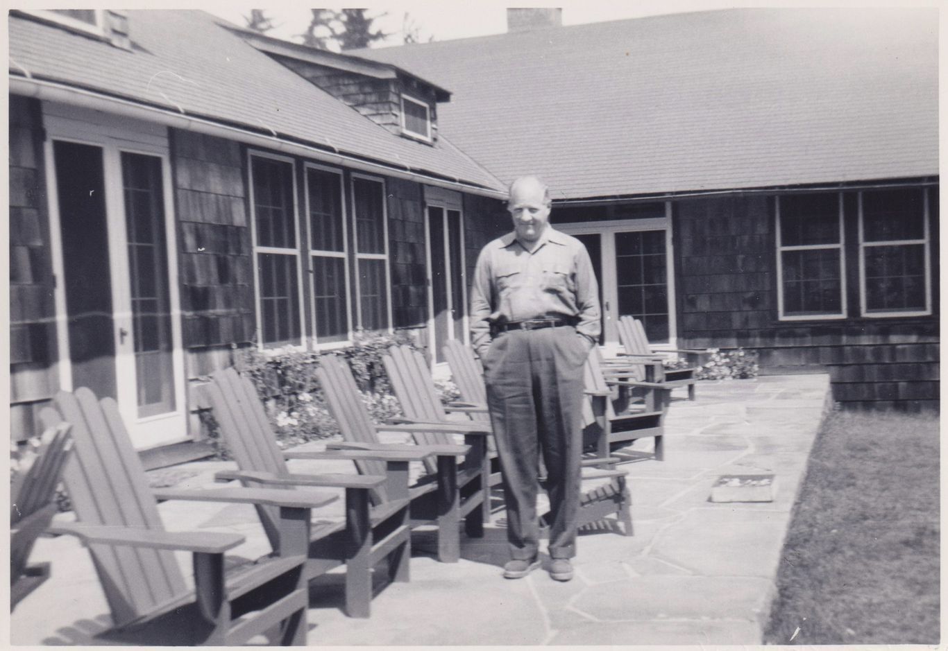 Black-and-White photograph of a man standing with his hands in his pockets outside of an unidentified building at the Bartlett Carry Club. Handwritten note on reverse reads, "Frank Hynes."