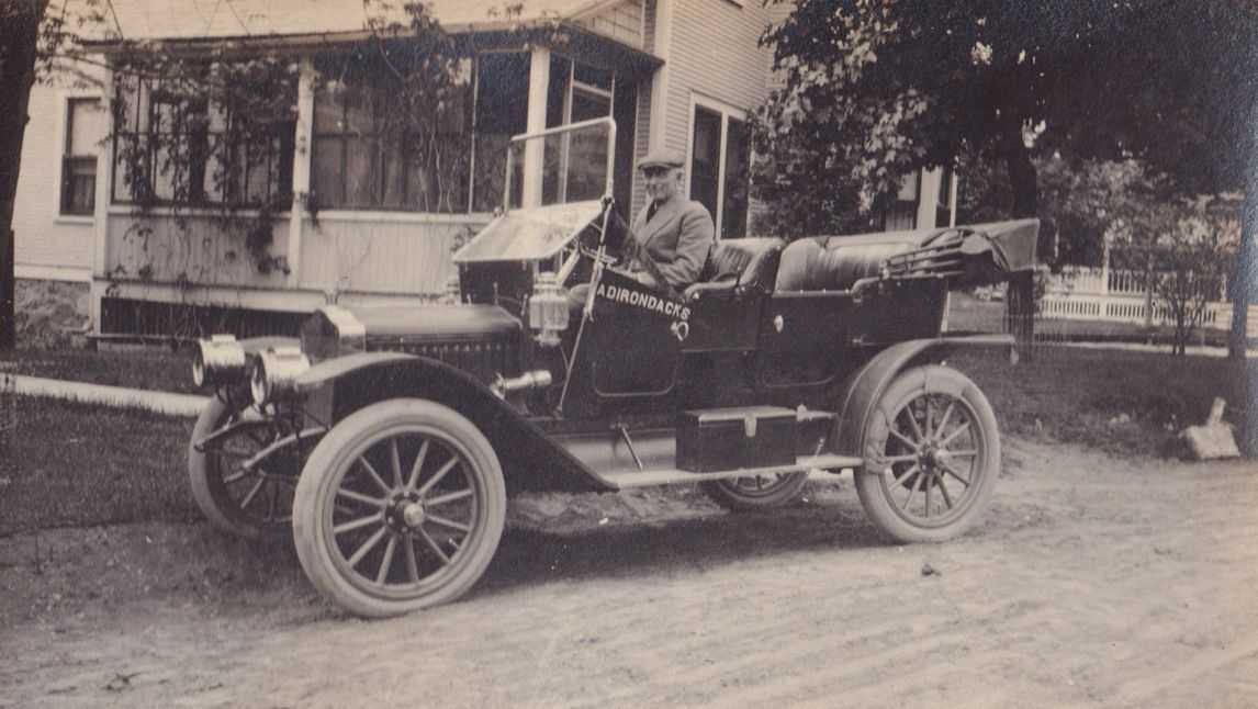 Black-and-white photograph of a car parked outside of a house with a windowed porch. The car has "Adirondacks" printed on the front door. There is a man sitting in the driver's seat.