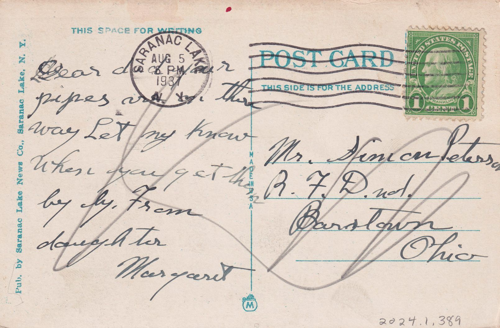 Postcard with an illustration of the Saranac Lake Post Office. The postcard is addressed to Mr. Simon Peterson.