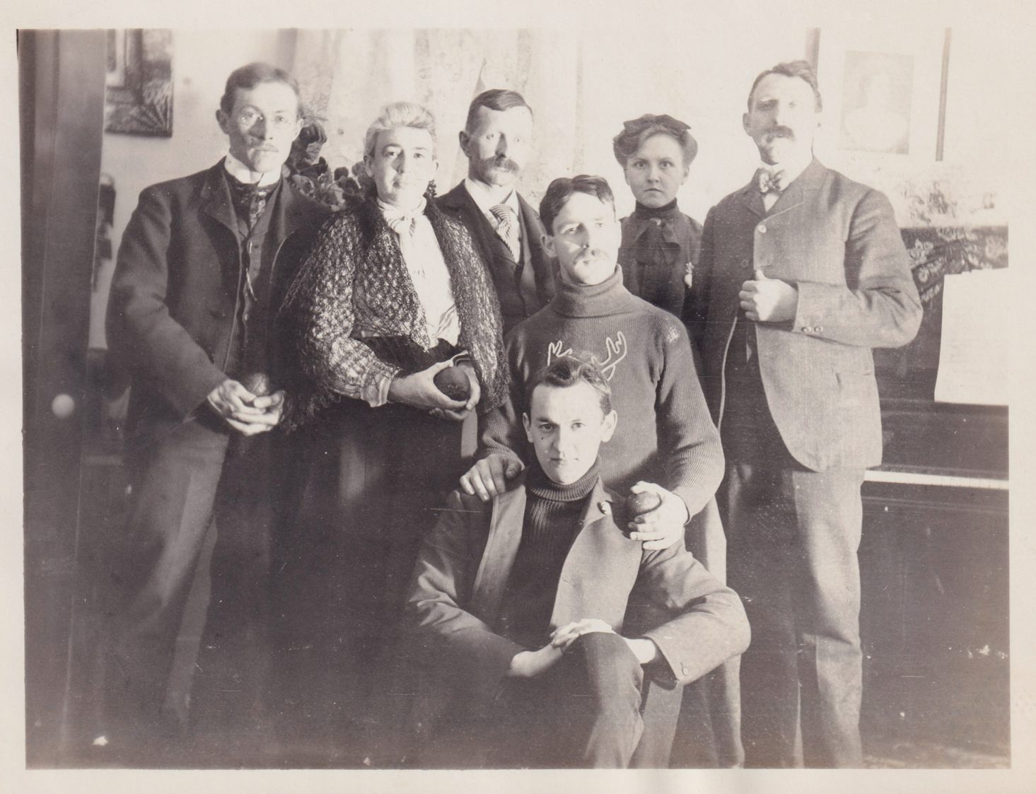 Black-and-White photograph of a group of seven men and women of varying age. Some of them are holding small balls, possibly bocce or candlepin bowling balls. One of the men is wearing a sweater with a deer embroidered on it; he is posing so that the antlers appear to be coming out of the head of the young man in front of him. The photograph was likely printed by Kollecker's Kodak and Gift Shop.